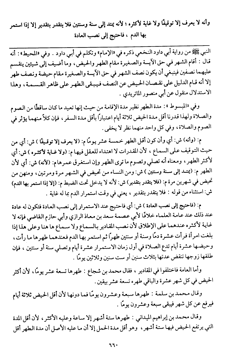 م: (وأنه) ش: أي وأن كون أقل الطهر خمسة عشر يوماً م: (لا يعرف إلا توقيفاً) ش: أي من حيث التوقيف على السماع، لأن المقدرات لا اهتداء للعقل فيها م: (ولا غاية لأكثره) ش: أي لأكثر الطهر، ومعناه أنه تصلي وتصوم ما ترى الطهر وإن استغرق عمرها م: (لأنه) ش: أي لأن الطهر م: (يمتد إلى سنة وسنتين) ش: ومن النساء من تحيض في الشهر مرة ومرتين، ومنهن من تحيض في شهرين مرة م: (فلا يتقدر بتقدير) ش: لأنه لا يدخل تحت الضبط م: (إلا إذا استمر بها الدم) ش: استثناء من قوله: فلا يتقدر بتقدير، يعني في وقت استمرار الدم بما له غاية.