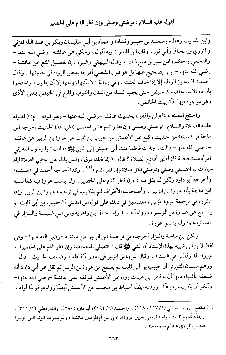 ولكن ابن ماجه والبزار أخرجاه في ترجمة ابن الزبير عن عائشة - رَضِيَ اللَّهُ عَنْهَا - وفي لفظ لابن أبي شيبة بهذا الإسناد أن النبي - صَلَّى اللَّهُ عَلَيْهِ وَسَلَّمَ - قال: «تصلي المستحاضة وإن قطر الدم على الحصير» ، ورواه الدارقطني في "سننه "، وقال عروة بن الزبير في بعض ألفاظه، وضعف الحديث. قال: وزعم سفيان الثوري أن حبيب بن أبي ثابت لم يسمع من عروة بن الزبير ثم نقل عن أبي داود أنه ضعفه بأشياء منها أن حفص بن غياث رواه عن الأعمش فوقفه على عائشة - رَضِيَ اللَّهُ عَنْهَا - وأنكر أن يكون مرفوعاً. ووقفه أيضاً أسباط بن محمد عن الأعمش أيضاً رواه مرفوعاً أوله،