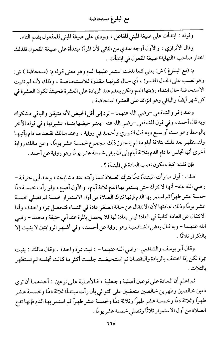 وعند زفر والشافعي - رَضِيَ اللَّهُ عَنْهُمَا - ترد إلى أقل الحيض لأنه متيقن والباقي مشكوك وبه قال أحمد، وفي قول للشافعي - رَضِيَ اللَّهُ عَنْهُ - يعتبر حيضها بنساء عشيرتها وفي قوله الآخر بالوسط وهو ست أو سبع وبه قال الثوري وأحمد في رواية، وعند مالك تقعد ما دام يأتيها ولتستظهر بعد ذلك بثلاثة أيام ما لم يتجاوز ذلك مجموع خمسة عشر يوماً، وعن مالك رواية أخرى أنها تجلس ما دام الدم بثلاثة أيام إلى أن يبقى خمسة عشر يوماً وهو رواية عن أحمد.
