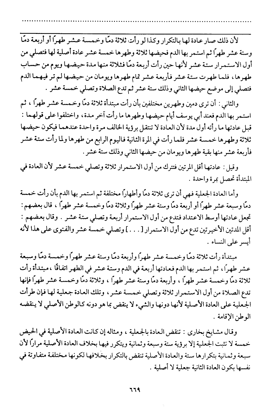 وأما العادة الجعلية فهي أن ترى ثلاثة دما وأطهاراً مختلفة ثم استمر بها الدم بأن رأت خمسة دماً وسبعة عشر طهرا أو أربعة دما وستة عشر طهرا وثلاثة دما وخمسة عشر طهرا، قال بعضهم: تجعل عادتها أوسط الاعتداد فتدع من أول الاستمرار أربعة وتصلي ستة عشر. وقال بعضهم: أقل المدتين الأخيرتين تدع من أول الاستمرار [ ... ] وتصلي خمسة عشر والفتوى على هذا لأنه أيسر على النساء.