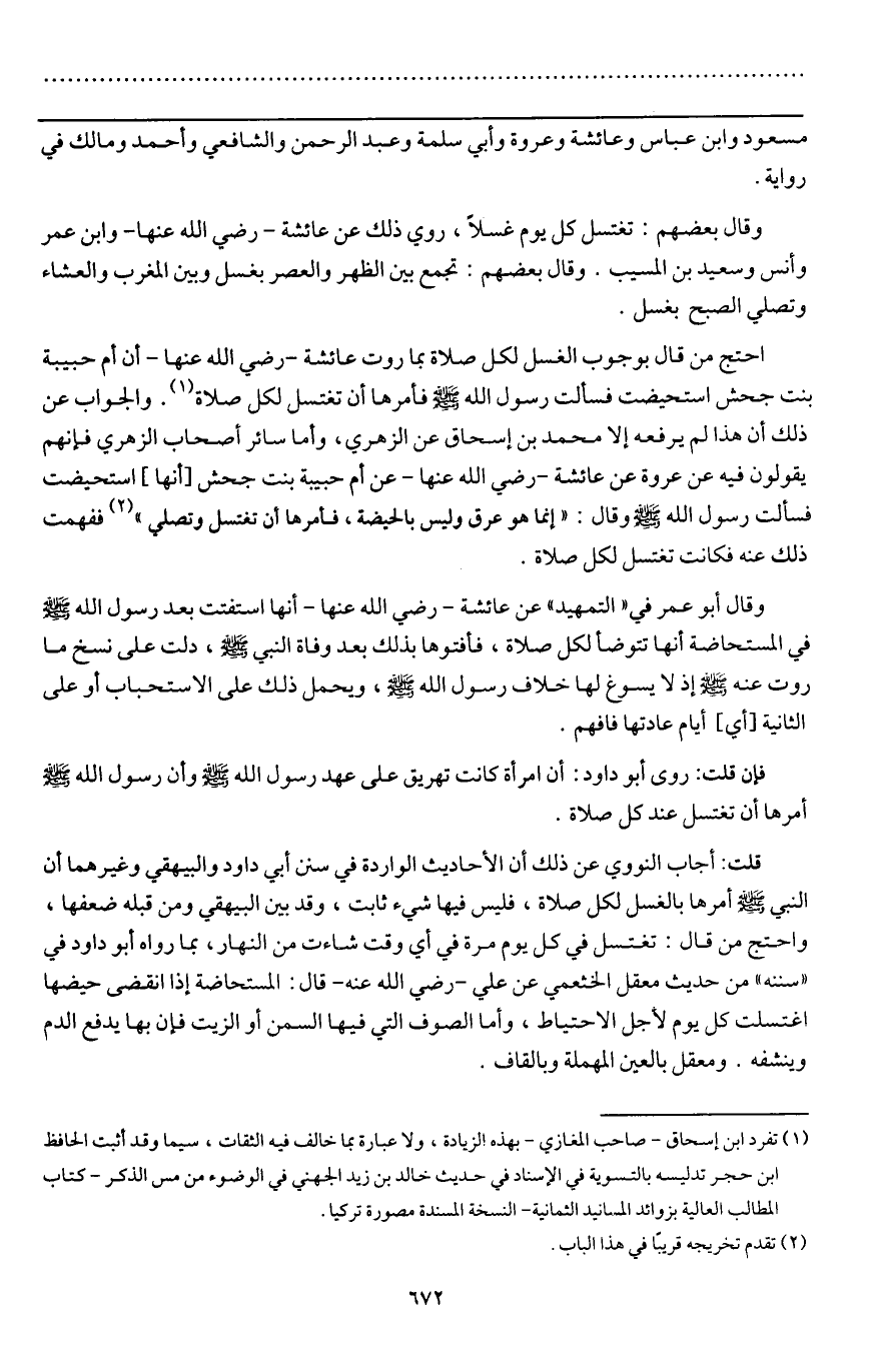 احتج من قال بوجوب الغسل لكل صلاة بما «روت عائشة - رَضِيَ اللَّهُ عَنْهَا - أن أم حبيبة بنت جحش استحيضت فسألت رسول الله - صَلَّى اللَّهُ عَلَيْهِ وَسَلَّمَ - فأمرها أن تغتسل لكل صلاة» والجواب عن ذلك أن هذا لم يرفعه إلا محمد بن إسحاق عن الزهري، وأما سائر أصحاب الزهري فإنهم يقولون فيه عن عروة عن عائشة - رَضِيَ اللَّهُ عَنْهَا - «عن أم حبيبة بنت جحش [أنها] استحيضت فسألت رسول الله - صَلَّى اللَّهُ عَلَيْهِ وَسَلَّمَ - وقال: "إنما هو عرق وليس بالحيضة، فأمرها أن تغتسل وتصلي» ففهمت ذلك عنه فكانت تغتسل لكل صلاة.
