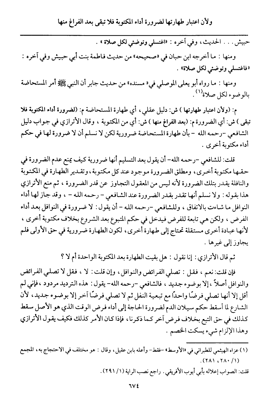 قلت: للشافعي - رَحِمَهُ اللَّهُ - أن يقول بعد التسليم أنها ضرورية كيف يمنع عدم الضرورة في حقها مكتوبة أخرى، ومطلق الضرورة موجود عند كل مكتوبة، وتقدير الطهارة في المكتوبة والنافلة يقدر بتلك الضرورة لأنه ليس من المعقول التجاوز عن قدر الضرورة، ثم منع الأترازي هذا بقوله: ولا نسلم أنها تقدر بقدر الضرورة عند الشافعي - رَحِمَهُ اللَّهُ -، وقد جاز لها أداء النوافل ما شاءت بالاتفاق، وللشافعي - رَحِمَهُ اللَّهُ -، أن يقول: لا ضرورة في النوافل بعد أداء الفرض، ولكن هي تابعة للفرض فيدخل في حكم المتبوع بعد الشروع بخلاف مكتوبة أخرى، لأنها عبادة أخرى مستقلة تحتاج إلى طهارة أخرى، لكون الطهارة ضرورية في حق الأولى فلم يجاوز إلى غيرها.