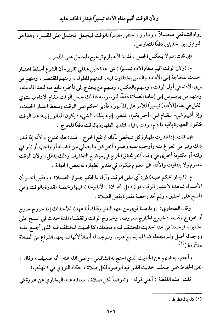 فإن قلت: إذا قدرت طهارة كل شخص بأدائه ارتفع الحرج. قلت: هذا ممنوع، لأنه إذ قدر ذلك وفرض الفراغ منه وأوجب عليه وضوء آخر كل ما يصلي من قضاء أو واجب أو نذر في وقته أو مكتوبة أخرى في وقت آخر تحقق الحرج في موضع التخفيف وذلك باطل، ولأن الوقت معلوم ولا يتفاوت والأداء غير معلوم فيكون في تقدير الطهارة به بعض الجهالة.