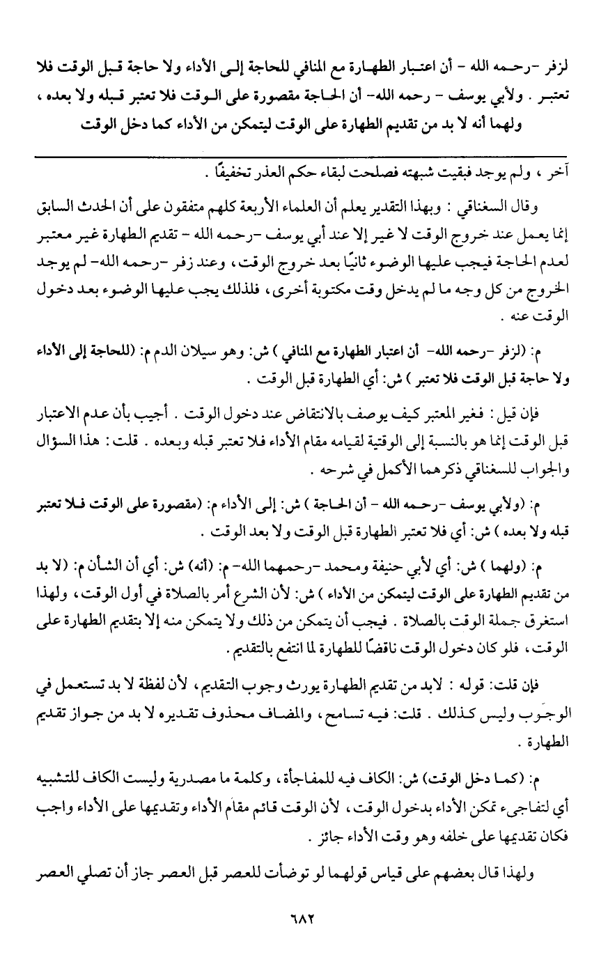 وقال السغناقي: وبهذا التقدير يعلم أن العلماء الأربعة كلهم متفقون على أن الحدث السابق إنما يعمل عند خروج الوقت لا غير إلا عند أبي يوسف - رَحِمَهُ اللَّهُ - تقديم الطهارة غير معتبر لعدم الحاجة فيجب عليها الوضوء ثانياً بعد خروج الوقت، وعند زفر - رَحِمَهُ اللَّهُ - لم يوجد الخروج من كل وجه ما لم يدخل وقت مكتوبة أخرى، فلذلك يجب عليها الوضوء بعد خول الوقت عنه.
