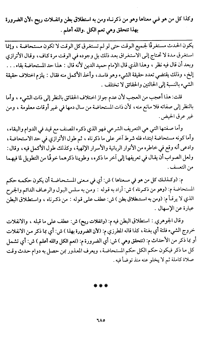 ـــــــــــــــــــــــــــــQيكون الحدث مستغرقا لجميع الوقت حتى لو لم تستغرق كل الوقت لا تكون مستحاضة، وإنما استغرق مدة لا تحتاج إلى الاستغراق بعد ذلك بل وجوده في الوقت مرة كاف، وقال الأترازي وبعد أن قال فيه نظر، وهذا الذي قال الإمام حميد الدين لأنه قال: هذا حد المستحاضة بقاء.. إلخ، وذلك يقتضي تعدد حقيقة الشيء وهو فاسد، وأخذ الأكمل منه فقال: يلزم اختلاف حقيقة الشيء بالنسبة إلى الحالتين والحقائق لا تختلف.