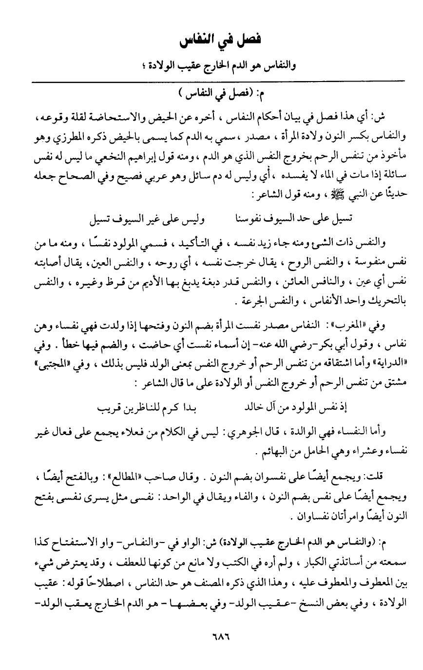 م: (والنفاس هو الدم الخارج عقيب الولادة) ش: الواو في - والنفاس - واو الاستفتاح كذا سمعته من أساتذتي الكبار، ولم أره في الكتب ولا مانع من كونها للعطف، وقد يعترض شيء بين المعطوف والمعطوف عليه، وهذا الذي ذكره المصنف هو حد النفاس، اصطلاحاً قول: عقيب الولادة، وفي بعض النسخ - عقيب الولد - وفي بعضها - هو الدم الخارج يعقب الولد -