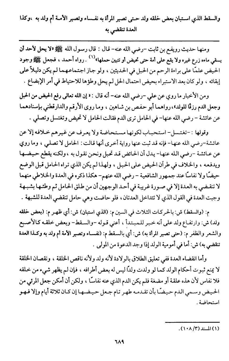 ـــــــــــــــــــــــــــــQومنها حديث رويفع بن ثابت - رَضِيَ اللَّهُ عَنْهُ - قال: قال رسول الله - صَلَّى اللَّهُ عَلَيْهِ وَسَلَّمَ - «لا يحل لأحد أن يسقي ماءه زرع غيره ولا يقع على أمة حتى تحيض أو تتبين حملها» . رواه أحمد، فجعل - صَلَّى اللَّهُ عَلَيْهِ وَسَلَّمَ - وجود الحيض علماً على براءة الرحم من الحبل في الحديثين، ولو جاز اجتماعهما لم يكن دليلاً على إبقائه، ولو كان بعد الاستبراء بحيض احتمال الحل لم يحل وطؤها للاحتياط في أمر الإبضاع.