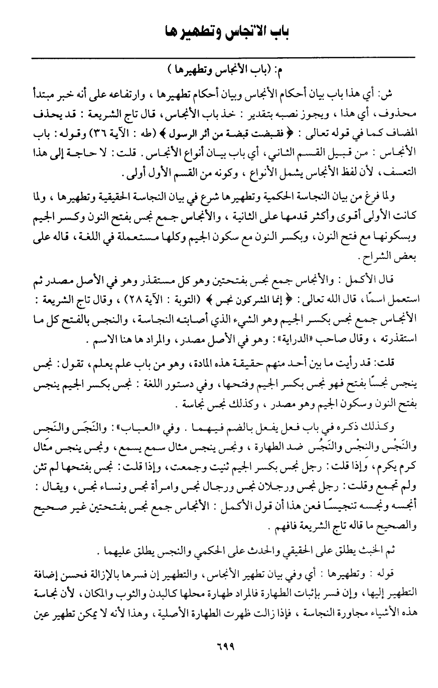 قال: الأكمل: والأنجاس جمع نجس بفتحتين وهو كل مستقذر وهو في الأصل مصدر ثم استعمل اسما، قال الله تعالى: {إِنَّمَا الْمُشْرِكُونَ نَجَسٌ} [التوبة: 28] (التوبة: الآية 28) ، وقال تاج الشريعة: الأنجاس جمع نجس بكسر الجيم وهو الشيء الذي أصابته النجاسة، والنجس بالفتح كل ما استقذرته، وقال صاحب " الدراية ": وهو في الأصل مصدر، والمراد هاهنا الاسم.