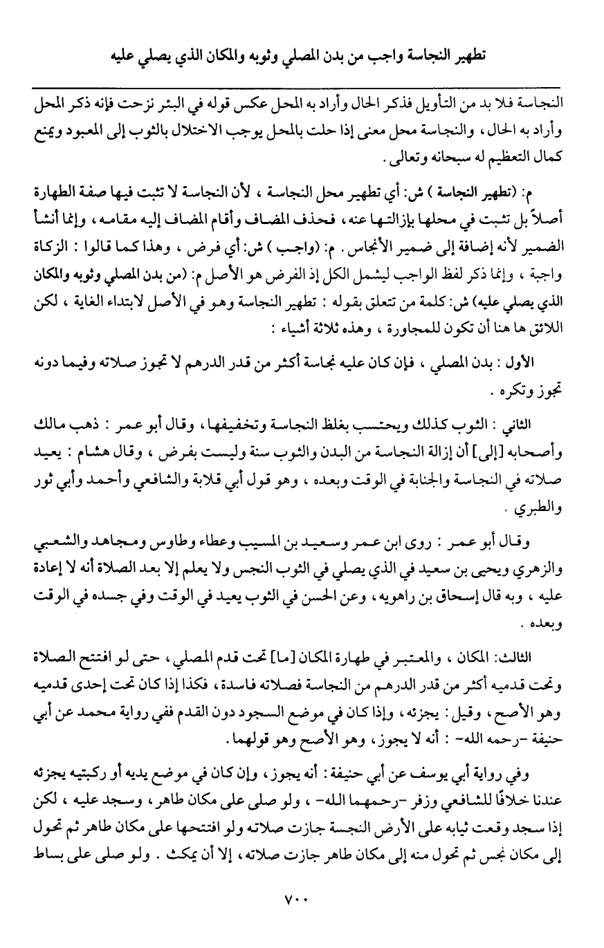 م: (تطهير النجاسة) ش: أي تطهير محل النجاسة، لأن النجاسة لا تثبت فيها صفة الطهارة أصلاً بل تثبت في محلها بإزالتها عنه، فحذف المضاف وأقام المضاف إليه مقامه، وإنما أنشأ الضمير لأنه إضافة إلى ضمير الأنجاس. م: (واجب) ش: أي فرض، وهذا كما قالوا: الزكاة واجبة، وإنما ذكر لفظ الواجب ليشمل الكل إذ الفرض هو الأصل م: (من بدن المصلي وثوبه والمكان الذي يصلي عليه) ش: كلمة من تتعلق بقوله: تطهير النجاسة وهو في الأصل لابتداء الغاية، لكن اللائق هاهنا أن تكون للمجاورة، وهذه ثلاثة أشياء: