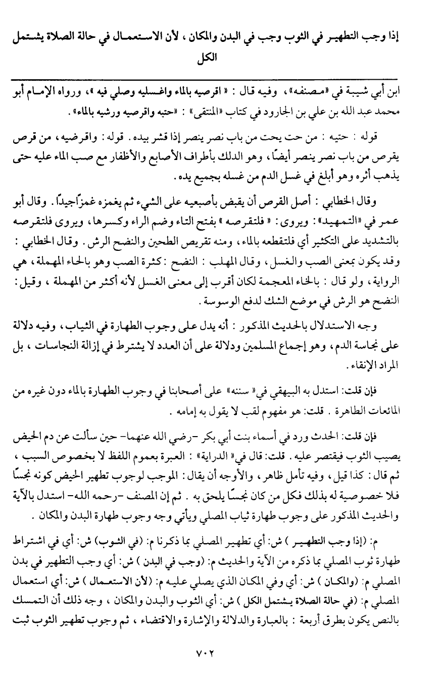 وجه الاستدلال بالحديث المذكور: أنه يدل على وجوب الطهارة في الثياب، وفيه دلالة على نجاسة الدم، وهو إجماع المسلمين ودلالة على أن العدد لا يشترط في إزالة النجاسات، بل المراد الإنقاء.