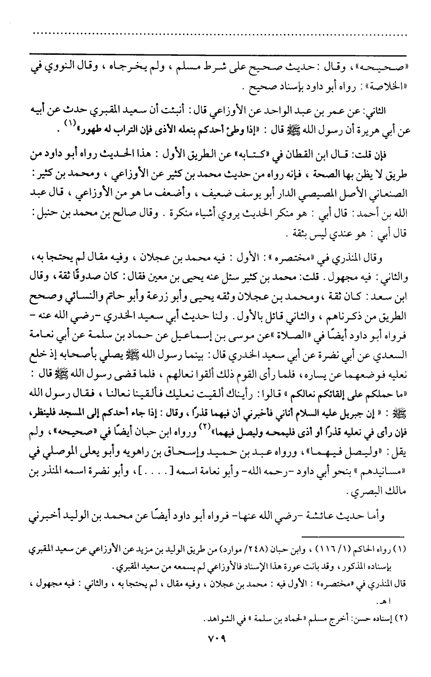 وقال المنذري في "مختصره ": الأول: فيه محمد بن عجلان، وفيه مقال لم يحتجا به، والثاني: فيه مجهول. قلت: محمد بن كثير سئل عنه يحيى بن معين فقال: كان صدوقاً ثقة، وقال ابن سعد: كان ثقة، ومحمد بن عجلان وثقه يحيى وأبو زرعة وأبو حاتم والنسائي وصحح الطريق من ذكرناهم، والثاني قائل بالأول. ولنا حديث أبي سعيد الخدري - رَضِيَ اللَّهُ عَنْهُ - فرواه أبو داود أيضاً في " الصلاة " عن موسى بن إسماعيل عن حماد بن سلمة عن أبي نعامة السعدي عن أبي نضرة عن أبي سعيد الخدري قال: «بينما رسول الله - صَلَّى اللَّهُ عَلَيْهِ وَسَلَّمَ - يصلي بأصحابه إذ خلع نعليه فوضعهما عن يساره، فلما رأى القوم ذلك ألقوا نعالهم، فلما قضى رسول الله - صَلَّى اللَّهُ عَلَيْهِ وَسَلَّمَ - قال: "ما حملكم على إلقائكم نعالكم" قالوا: رأيناك ألقيت نعليك فألقينا نعالنا، فقال رسول الله - صَلَّى اللَّهُ عَلَيْهِ وَسَلَّمَ -: "إن جبريل - عَلَيْهِ السَّلَامُ - أتاني فأخبرني أن فيهما قذراً، وقال: إذا جاء أحدكم إلى المسجد فلينظر، فإن رأى في نعليه قذراً أو أذى فليمحه وليصل فيهما» ورواه ابن حبان أيضاً في "صحيحه "، ولم يقل: "وليصل فيهما"، ورواه عبد بن حميد وإسحاق بن راهويه وأبو يعلى الموصلي في "مسانيدهم " بنحو أبي داود - رَحِمَهُ اللَّهُ - وأبو نعامة اسمه [......] ، وأبو نضرة اسمه المنذر بن مالك البصري.