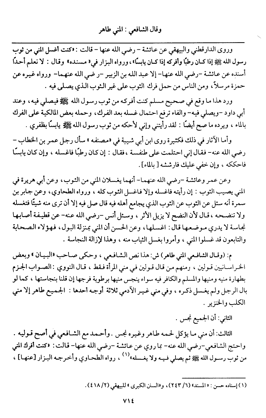 الثالث: أن مني ما يؤكل لحمه طاهر وغيره نجس. وأحمد مع الشافعي في أصح قوليه. واحتج الشافعي - رَضِيَ اللَّهُ عَنْهُ - بما روي «عن عائشة - رَضِيَ اللَّهُ عَنْهَا - قالت: "كنت أفرك المني من ثوب رسول الله - صَلَّى اللَّهُ عَلَيْهِ وَسَلَّمَ - ثم يصلي فيه ولا يغسله» ، رواه الطحاوي وأخرجه البزار [عنها] ،