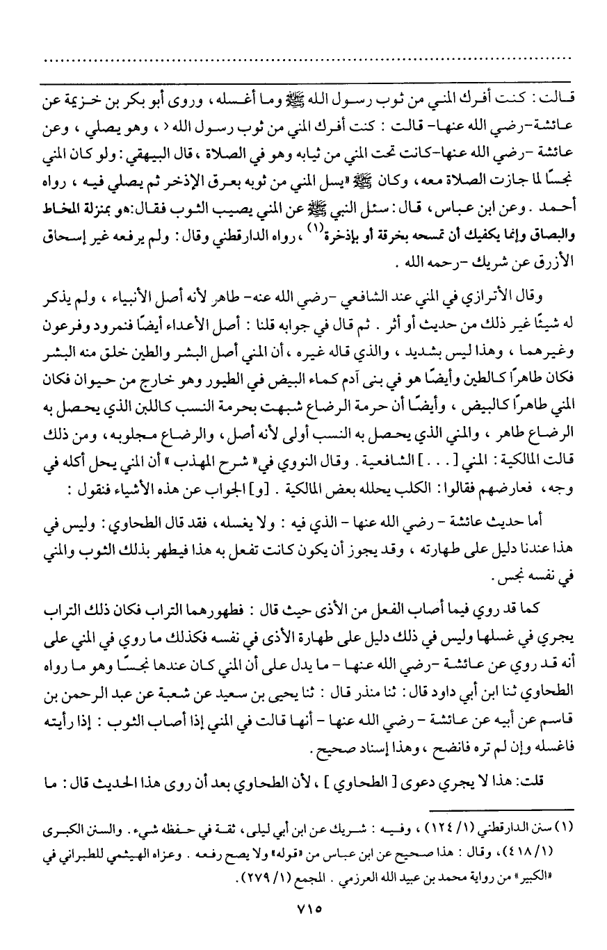 أما حديث عائشة - رَضِيَ اللَّهُ عَنْهَا - الذي فيه: ولا يغسله، فقد قال الطحاوي: وليس في هذا عندنا دليل على طهارته، وقد يجوز أن يكون كانت تفعل به هذا فيطهر بذلك الثوب والمني في نفسه نجس.