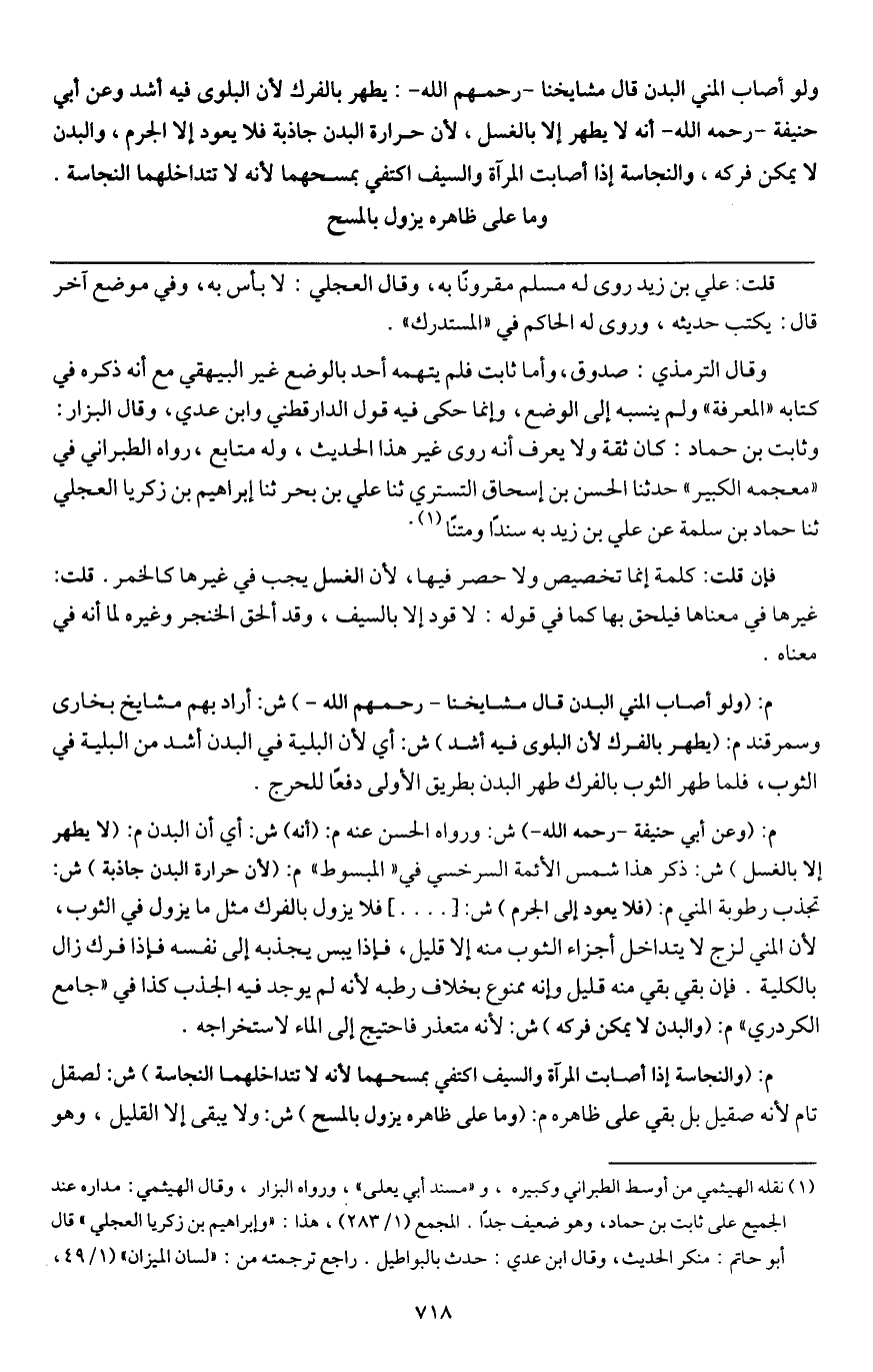 ولو أصاب المني البدن قال مشايخنا - رَحِمَهُمُ اللَّهُ -: يطهر بالفرك لأن البلوى فيه أشد وعن أبي حنيفة - رَحِمَهُ اللَّهُ - أنه لا يطهر إلا بالغسل، لأن حرارة البدن جاذبة فلا يعود إلا الجرم، والبدن لا يمكن فركه،