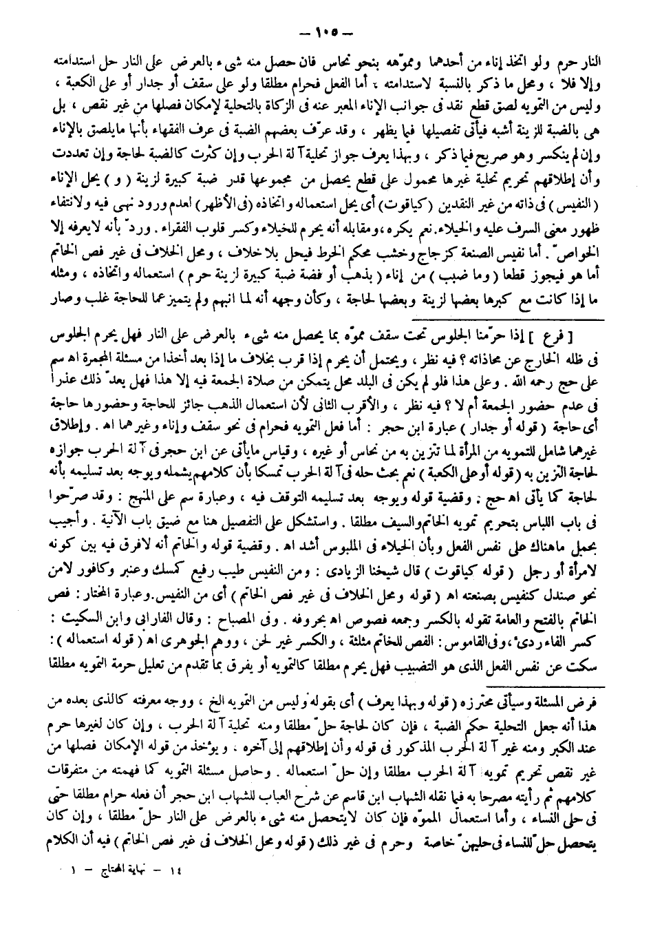 النَّارِ حَرُمَ وَلَوْ اتَّخَذَ إنَاءً مِنْ أَحَدِهِمَا وَمَوَّهَهُ بِنَحْوِ نُحَاسٍ فَإِنْ حَصَلَ مِنْهُ شَيْءٌ بِالْعَرْضِ عَلَى النَّارِ حَلَّ اسْتِدَامَتُهُ وَإِلَّا فَلَا، وَمَحَلُّ مَا ذُكِرَ بِالنِّسْبَةِ لِاسْتِدَامَتِهِ، أَمَّا الْفِعْلُ فَحَرَامٌ مُطْلَقًا وَلَوْ عَلَى سَقْفٍ أَوْ جِدَارٍ أَوْ عَلَى الْكَعْبَةِ، وَلَيْسَ مِنْ التَّمْوِيهِ لَصْقُ قِطَعِ نَقْدٍ فِي جَوَانِبِ الْإِنَاءِ الْمُعَبَّرِ عَنْهُ فِي الزَّكَاةِ بِالتَّحْلِيَةِ لِإِمْكَانِ فَصْلِهَا مِنْ غَيْرِ نَقْصٍ، بَلْ هِيَ بِالضَّبَّةِ لِلزِّينَةِ أَشْبَهُ فَيَأْتِي تَفْصِيلُهَا فِيمَا يَظْهَرُ، وَقَدْ عَرَّفَ بَعْضُهُمْ الضَّبَّةَ فِي عُرْفِ الْفُقَهَاءِ بِأَنَّهَا مَا يُلْصَقُ بِالْإِنَاءِ وَإِنْ لَمْ يَنْكَسِرْ وَهُوَ صَرِيحٌ فِيمَا ذُكِرَ، وَبِهَذَا يُعْرَفُ جَوَازُ تَحْلِيَةِ آلَةِ الْحَرْبِ وَإِنْ كَثُرَتْ كَالضَّبَّةِ لِحَاجَةٍ وَإِنْ تَعَدَّدَتْ وَأَنَّ إطْلَاقَهُمْ تَحْرِيمَ تَحْلِيَةِ غَيْرِهَا مَحْمُولٌ عَلَى قَطْعٍ يَحْصُلُ مِنْ مَجْمُوعِهَا قَدْرَ ضَبَّةٍ كَبِيرَةٍ لِزِينَةٍ
