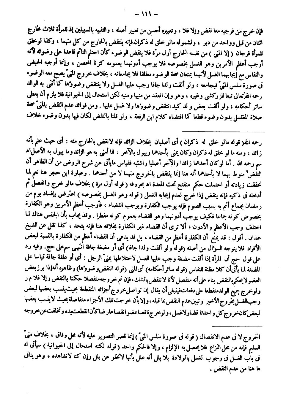 فَإِنْ خَرَجَ مِنْ فَرْجَيْهِ مَعًا نَقَضَ وَإِلَّا فَلَا، وَتَعْبِيرُهُ أَحْسَنُ مِنْ تَعْبِيرِ أَصْلِهِ، وَالتَّنْبِيهُ بِالسَّبِيلَيْنِ إذْ لِلْمَرْأَةِ ثَلَاثُ مَخَارِجَ اثْنَانِ مِنْ قُبُلٍ وَوَاحِدٌ مِنْ دُبُرٍ، وَلِشُمُولِهِ مَا لَوْ خُلِقَ لَهُ ذَكَرَانِ فَإِنَّهُ يُنْتَقَضُ بِالْخَارِجِ مِنْ كُلٍّ مِنْهُمَا، وَكَذَا لَوْ خُلِقَ لِلْمَرْأَةِ فَرْجَانِ (إلَّا الْمَنِيَّ) مِنْ نَفْسِهِ الْخَارِجَ أَوَّلَ مَرَّةٍ فَلَا يَنْقُضُ الْوُضُوءَ كَأَنْ احْتَلَمَ النَّائِمُ قَاعِدًا عَلَى وُضُوئِهِ؛ لِأَنَّهُ أَوْجَبَ أَعْظَمَ الْأَمْرَيْنِ وَهُوَ الْغُسْلُ بِخُصُوصِهِ فَلَا يُوجِبُ أَدْوَنَهُمَا بِعُمُومِهِ كَزِنَا الْمُحْصَنِ، وَإِنَّمَا أَوْجَبَهُ الْحَيْضُ وَالنِّفَاسُ مَعَ إيجَابِهِمَا الْغُسْلَ؛ لِأَنَّهُمَا يَمْنَعَانِ صِحَّةَ الْوُضُوءِ مُطْلَقًا فَلَا يُجَامِعَانِهِ، بِخِلَافِ خُرُوجِ الْمَنِيِّ يَصِحُّ مَعَهُ الْوُضُوءُ فِي صُورَةِ سَلَسِ الْمَنِيِّ فَيُجَامِعُهُ.