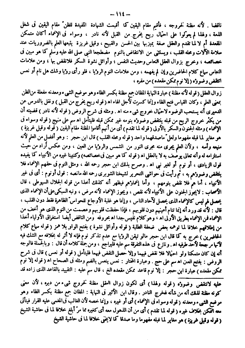 نَاقِضًا؛ لِأَنَّهُ مَظِنَّةٌ لِخُرُوجِهِ، فَأُقِيمَ مَقَامَ الْيَقِينِ كَمَا أُقِيمَتْ الشَّهَادَةُ الْمُفِيدَةُ لِلظَّنِّ مَقَامَ الْيَقِينِ فِي شَغْلِ الذِّمَّةِ، وَلِهَذَا لَمْ يُعَوِّلُوا عَلَى احْتِمَالِ رِيحٍ يَخْرُجُ مِنْ الْقُبُلِ؛ لِأَنَّهُ نَادِرٌ، وَسَوَاءٌ فِي الْإِغْمَاءِ أَكَانَ مُتَمَكِّنَ الْمَقْعَدَةِ أَمْ لَا؛ لِمَا تَقَدَّمَ وَالْعَقْلُ صِفَةٌ يُمَيِّزُ بِهَا بَيْنَ الْحَسَنِ وَالْقَبِيحِ، وَقِيلَ غَرِيزَةٌ يَتْبَعُهَا الْعِلْمُ بِالضَّرُورِيَّاتِ عِنْدَ سَلَامَةِ الْآلَاتِ وَمَحَلُّهُ الْقَلْبُ، وَيُسْتَثْنَى مِنْ الِانْتِقَاضِ بِالنَّوْمِ مُضْطَجِعًا النَّبِيُّ - صَلَّى اللَّهُ عَلَيْهِ وَسَلَّمَ - كَمَا هُوَ مُبَيَّنٌ فِي خَصَائِصِهِ؛ وَخَرَجَ بِزَوَالِ الْعَقْلِ النُّعَاسُ وَحَدِيثُ النَّفْسِ، وَأَوَائِلُ نَشْوَةِ السُّكْرِ فَلَا نَقْضَ بِهَا؛ وَمِنْ عَلَامَاتِ النُّعَاسِ سَمَاعُ كَلَامِ الْحَاضِرِينَ وَإِنْ لَمْ يَفْهَمْهُ.
