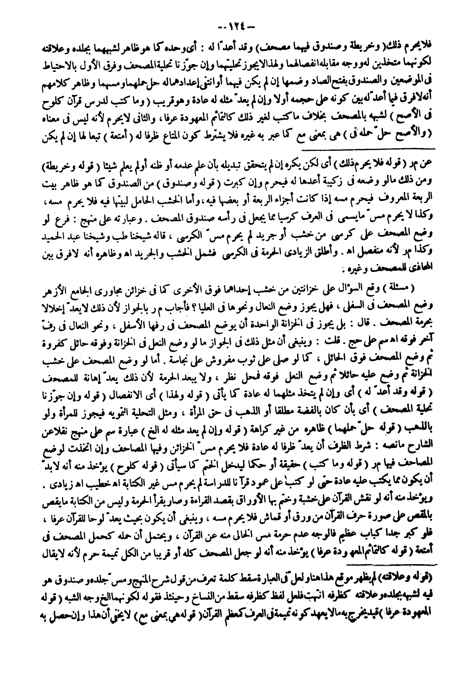 (مَسْأَلَةٌ) وَقَعَ السُّؤَالُ عَلَى خِزَانَتَيْنِ مِنْ خَشَبٍ إحْدَاهُمَا فَوْقَ الْأُخْرَى كَمَا فِي خَزَائِنِ مُجَاوِرِي الْجَامِعِ الْأَزْهَرِ وُضِعَ الْمُصْحَفُ فِي السُّفْلَى، فَهَلْ يَجُوزُ وَضْعُ النِّعَالِ وَنَحْوِهَا فِي الْعُلْيَا؟ فَأَجَابَ م ر بِالْجَوَازِ؛ لِأَنَّ ذَلِكَ لَا يُعَدُّ إخْلَالًا بِحُرْمَةِ الْمُصْحَفِ. قَالَ: بَلْ يَجُوزُ فِي الْخِزَانَةِ الْوَاحِدَةِ أَنْ يُوضَعَ الْمُصْحَفُ فِي رَفِّهَا الْأَسْفَلِ، وَنَحْوُ النِّعَالِ فِي رَفٍّ آخَرُ فَوْقَهُ اهـ سم عَلَى حَجّ. قُلْت: وَيَنْبَغِي أَنَّ مِثْلَ ذَلِكَ فِي الْجَوَازِ مَا لَوْ وُضِعَ النَّعْلُ فِي الْخِزَانَةِ وَفَوْقَهُ حَائِلٌ كَفَرْوَةٍ ثُمَّ وَضَعَ الْمُصْحَفَ فَوْقَ الْحَائِلِ، كَمَا لَوْ صَلَّى عَلَى ثَوْبٍ مَفْرُوشٍ عَلَى نَجَاسَةٍ. أَمَّا لَوْ وَضَعَ الْمُصْحَفَ عَلَى خَشَبِ الْخِزَانَةِ ثُمَّ وَضَعَ عَلَيْهِ حَائِلًا ثُمَّ وَضَعَ النَّعْلَ فَوْقَهُ فَمَحَلُّ نَظَرٍ، وَلَا يَبْعُدُ الْحُرْمَةُ؛ لِأَنَّ ذَلِكَ يُعَدُّ إهَانَةً لِلْمُصْحَفِ (قَوْلُهُ: وَقَدْ أَعَدَّ لَهُ) أَيْ وَإِنْ لَمْ يَتَّخِذْ مِثْلَهُمَا لَهُ عَادَةً كَمَا يَأْتِي (قَوْلُهُ: وَلِهَذَا) أَيْ الِانْفِصَالُ (قَوْلُهُ: وَإِنْ جَوَّزْنَا تَحْلِيَةَ الْمُصْحَفِ) أَيْ بِأَنْ كَانَ بِالْفِضَّةِ مُطْلَقًا أَوْ الذَّهَبِ فِي حَقِّ الْمَرْأَةِ، وَمِثْلُ التَّحْلِيَةِ التَّمْوِيهُ فَيَجُوزُ لِلْمَرْأَةِ وَلَوْ بِالذَّهَبِ (قَوْلُهُ: حَلَّ حَمْلُهُمَا) ظَاهِرُهُ مِنْ غَيْرِ كَرَاهَةٍ (قَوْلُهُ: وَإِنْ لَمْ يُعَدَّ مِثْلُهُ لَهُ إلَخْ) عِبَارَةُ سم عَلَى مَنْهَجٍ نَقْلًا عَنْ الشَّارِحِ مَا نَصُّهُ: شَرْطُ الظَّرْفِ أَنْ يُعَدَّ ظَرْفًا لَهُ عَادَةً فَلَا يَحْرُمُ مَسُّ الْخَزَائِنِ وَفِيهَا الْمَصَاحِفُ وَإِنْ اُتُّخِذَتْ لِوَضْعِ الْمَصَاحِفِ فِيهَا م ر.