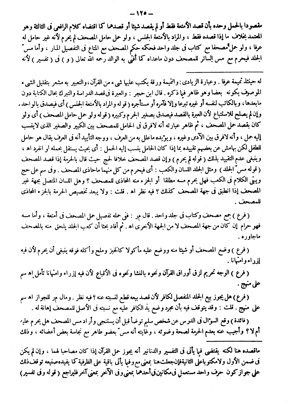 (فَرْعٌ) جَمْعُ مُصْحَفٍ وَكِتَابٍ فِي جِلْدٍ وَاحِدٍ. قَالَ م ر: فَفِي حَمْلِهِ تَفْصِيلُ حَمْلِ الْمُصْحَفِ فِي أَمْتِعَةٍ، وَأَمَّا مَسُّهُ فَهُوَ حَرَامٌ إنْ كَانَ مِنْ جِهَةِ الْمُصْحَفِ لَا مِنْ الْجِهَةِ الْأُخْرَى اهـ. ثُمَّ أَفَادَ بَحْثًا أَنَّ كَعْبَ الْجِلْدِ يَلْحَقُ مِنْهُ بِالْمُصْحَفِ مَا جَاوَرَهُ.