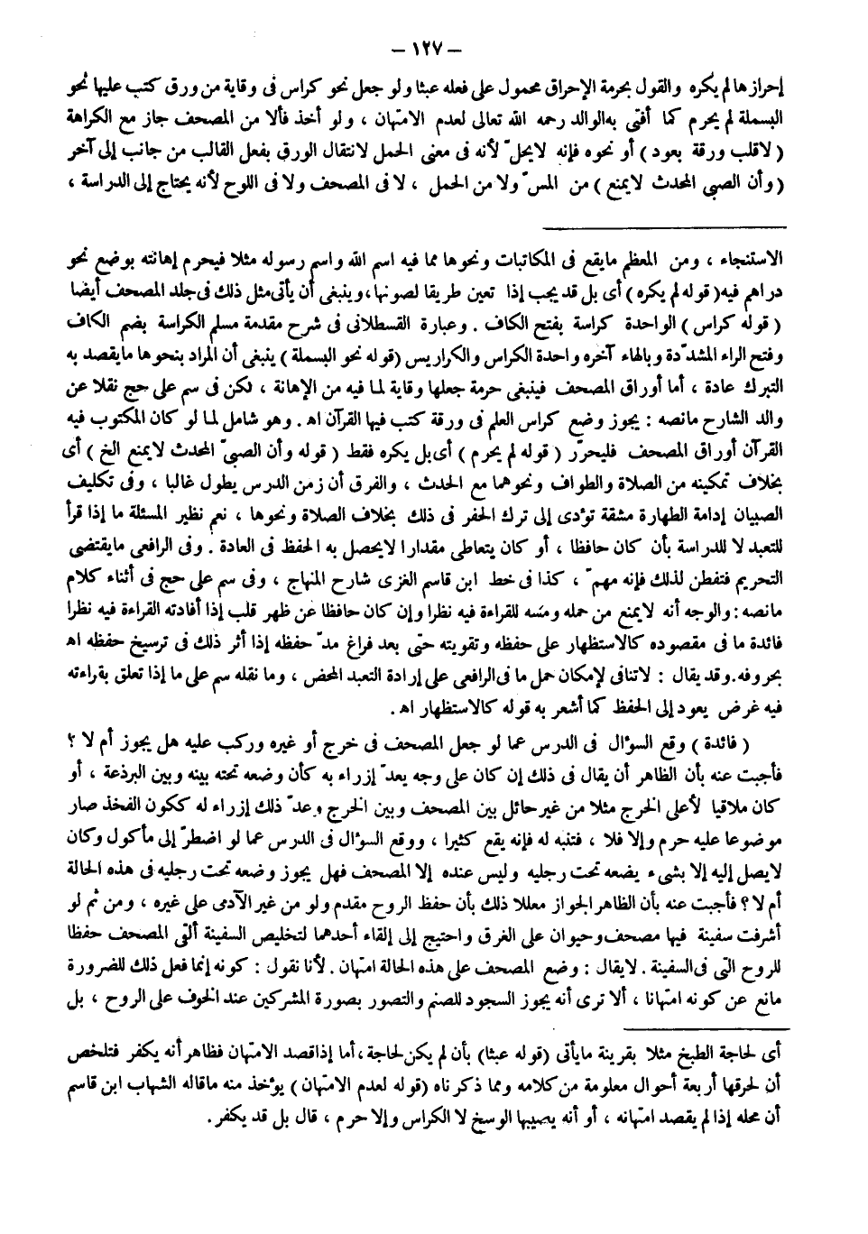 (فَائِدَةٌ) وَقَعَ السُّؤَالُ فِي الدَّرْسِ عَمَّا لَوْ جَعَلَ الْمُصْحَفَ فِي خُرْجٍ أَوْ غَيْرِهِ وَرُكِّبَ عَلَيْهِ هَلْ يَجُوزُ أَمْ لَا؟ فَأَجَبْت عَنْهُ بِأَنَّ الظَّاهِرَ أَنْ يُقَالَ فِي ذَلِكَ إنْ كَانَ عَلَى وَجْهٍ يُعَدُّ إزْرَاءً بِهِ كَأَنْ وَضَعَهُ تَحْتَهُ بَيْنَهُ وَبَيْنَ الْبَرْذَعَةِ، أَوْ كَانَ مُلَاقِيًا لِأَعْلَى الْخُرْجِ مَثَلًا مِنْ غَيْرِ حَائِلٍ بَيْنَ الْمُصْحَفِ وَبَيْنَ الْخُرْجِ وَعُدَّ ذَلِكَ إزْرَاءً لَهُ كَكَوْنِ الْفَخِذِ صَارَ مَوْضُوعًا عَلَيْهِ حَرُمَ وَإِلَّا فَلَا، فَتَنَبَّهْ لَهُ فَإِنَّهُ يَقَعُ كَثِيرًا، وَوَقَعَ السُّؤَالُ فِي الدَّرْسِ عَمَّا لَوْ اُضْطُرَّ إلَى مَأْكُولٍ وَكَانَ لَا يَصِلُ إلَيْهِ إلَّا بِشَيْءٍ يَضَعُهُ تَحْتَ رِجْلَيْهِ وَلَيْسَ عِنْدَهُ إلَّا الْمُصْحَفُ فَهَلْ يَجُوزُ وَضْعُهُ تَحْتَ رِجْلَيْهِ فِي هَذِهِ الْحَالَةِ أَمْ لَا؟ فَأَجَبْت عَنْهُ بِأَنَّ الظَّاهِرَ الْجَوَازُ مُعَلِّلًا ذَلِكَ بِأَنَّ حِفْظَ الرُّوحِ مُقَدَّمٌ وَلَوْ مِنْ غَيْرِ الْآدَمِيِّ عَلَى غَيْرِهِ، وَمِنْ ثَمَّ لَوْ أَشْرَفَتْ سَفِينَةٌ فِيهَا مُصْحَفٌ وَحَيَوَانٌ عَلَى الْغَرَقِ وَاحْتِيجَ إلَى إلْقَاءِ أَحَدِهِمَا لِتَخْلِيصِ السَّفِينَةِ أُلْقِيَ الْمُصْحَفُ حِفْظًا لِلرُّوحِ الَّتِي فِي السَّفِينَةِ.
