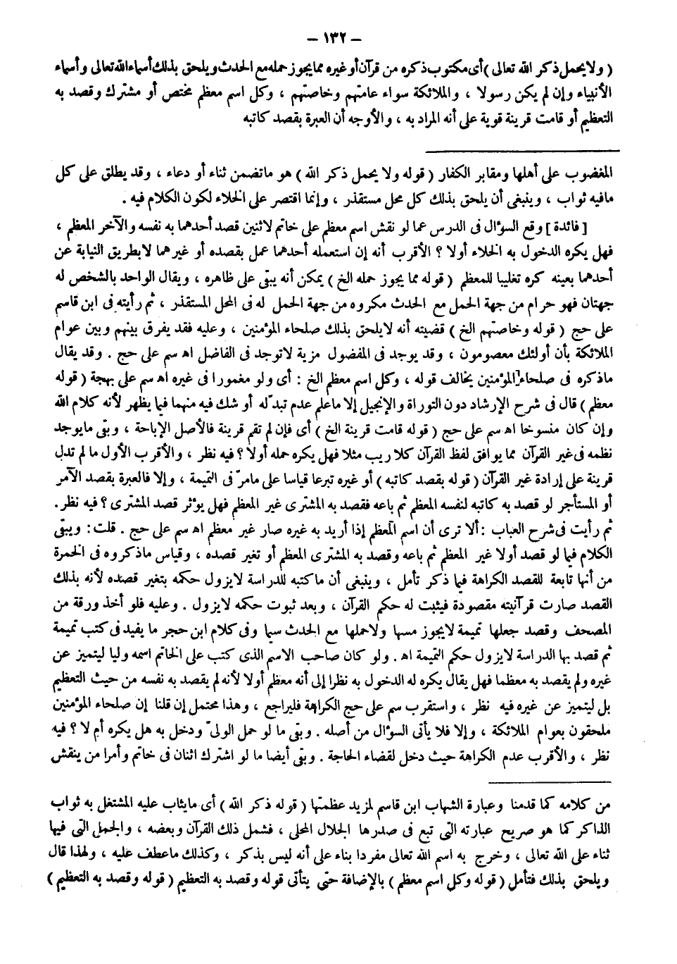 وَقَدْ يُقَالُ مَا ذَكَرَهُ فِي صُلَحَاءِ الْمُؤْمِنِينَ يُخَالِفُ قَوْلَهُ، وَكُلُّ اسْمٍ مُعَظَّمٍ إلَخْ: أَيْ وَلَوْ مَغْمُورًا فِي غَيْرِهِ اهـ سم عَلَى بَهْجَةٍ (قَوْلُهُ: مُعَظَّمٍ) قَالَ فِي شَرْحِ الْإِرْشَادِ دُونَ التَّوْرَاةِ وَالْإِنْجِيلِ إلَّا مَا عَلِمَ عَدَمَ تَبَدُّلِهِ أَوْ شَكَّ فِيهِ مِنْهُمَا فِيمَا يَظْهَرُ لِأَنَّهُ كَلَامُ اللَّهِ وَإِنْ كَانَ مَنْسُوخًا اهـ سم عَلَى حَجّ (قَوْلُهُ: قَامَتْ قَرِينَةٌ إلَخْ) أَيْ فَإِنْ لَمْ تَقُمْ قَرِينَةٌ فَالْأَصْلُ الْإِبَاحَةُ، وَبَقِيَ مَا يُوجَدُ نَظْمُهُ فِي غَيْرِ الْقُرْآنِ مِمَّا يُوَافِقُ لَفْظَ الْقُرْآنِ كَلَا رَيْبَ مَثَلًا فَهَلْ يُكْرَهُ حَمْلُهُ أَوْ لَا؟ فِيهِ نَظَرٌ، وَالْأَقْرَبُ الْأَوَّلُ مَا لَمْ تَدُلَّ قَرِينَةٌ عَلَى إرَادَةِ غَيْرِ الْقُرْآنِ (قَوْلُهُ: بِقَصْدِ كَاتِبِهِ) أَوْ غَيْرِهِ تَبَرُّعًا قِيَاسًا عَلَى مَا مَرَّ فِي التَّمِيمَةِ، وَإِلَّا فَالْعِبْرَةُ بِقَصْدِ الْآمِرِ أَوْ الْمُسْتَأْجِرِ لَوْ قَصَدَ بِهِ كَاتِبُهُ لِنَفْسِهِ الْمُعَظَّمَ ثُمَّ بَاعَهُ فَقَصَدَ بِهِ الْمُشْتَرِي غَيْرَ الْمُعَظَّمِ فَهَلْ يُؤَثِّرُ قَصْدُ الْمُشْتَرِي؟ فِيهِ نَظَرٌ.