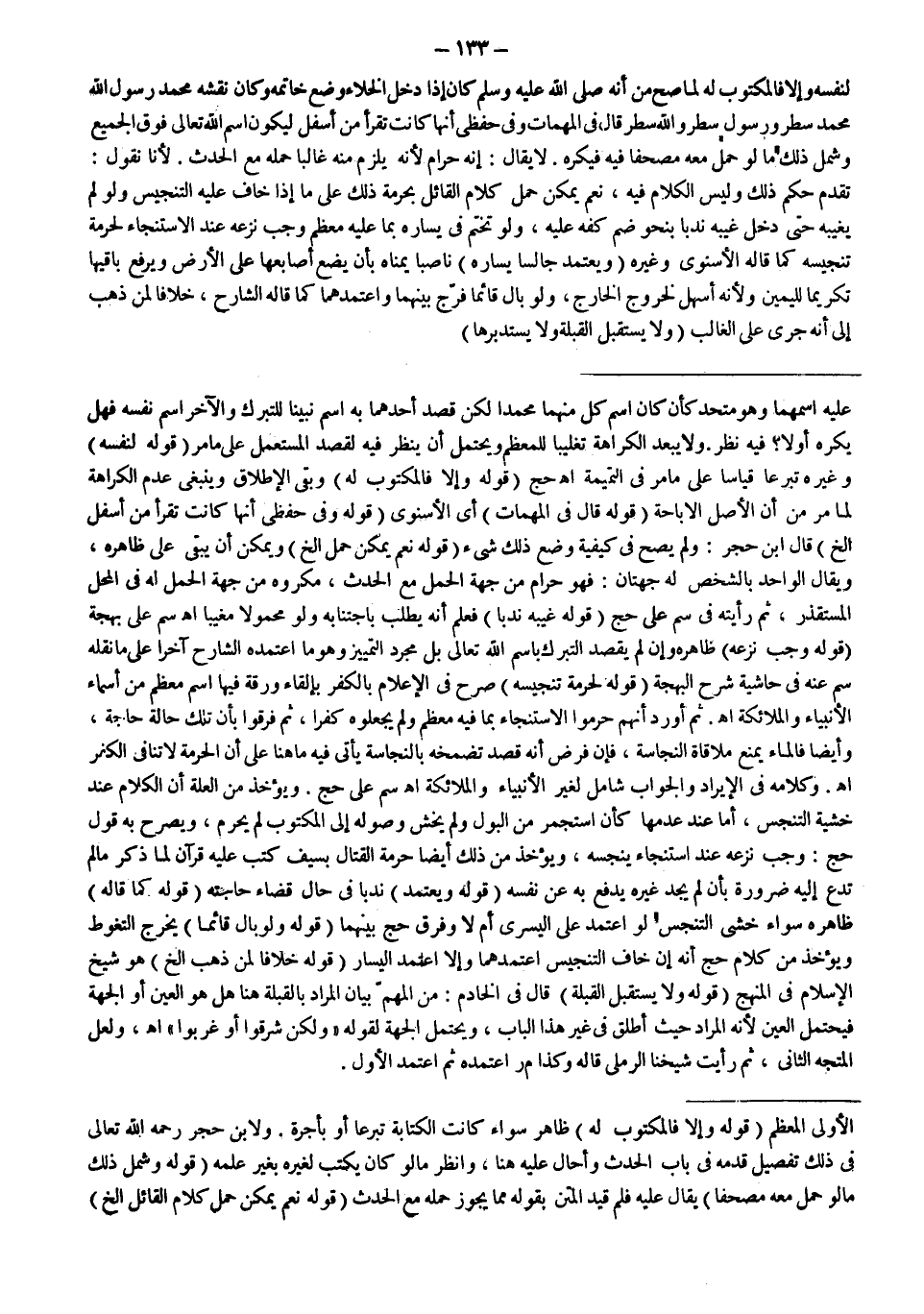 وَيُؤْخَذُ مِنْ الْعِلَّةِ أَنَّ الْكَلَامَ عِنْدَ خَشْيَةِ التَّنَجُّسِ، أَمَّا عِنْدَ عَدَمِهَا كَأَنْ اسْتَجْمَرَ مِنْ الْبَوْلِ وَلَمْ يَخْشَ وُصُولَهُ إلَى الْمَكْتُوبِ لَمْ يُحَرَّمْ، وَيُصَرِّحُ بِهِ قَوْلُ حَجّ: وَجَبَ نَزْعُهُ عِنْدَ اسْتِنْجَاءٍ يُنَجِّسُهُ، وَيُؤْخَذُ مِنْ ذَلِكَ أَيْضًا حُرْمَةُ الْقِتَالِ بِسَيْفٍ كُتِبَ عَلَيْهِ قُرْآنٌ لِمَا ذُكِرَ مَا لَمْ تَدْعُ إلَيْهِ ضَرُورَةٌ بِأَنْ لَمْ يَجِدْ غَيْرَهُ يَدْفَعُ بِهِ عَنْ نَفْسِهِ (قَوْلُهُ: وَيَعْتَمِدُ) نَدْبًا فِي حَالِ قَضَاءِ حَاجَتِهِ (قَوْلُهُ: كَمَا قَالَهُ) ظَاهِرُهُ سَوَاءٌ خَشِيَ التَّنَجُّسَ لَوْ اعْتَمَدَ عَلَى الْيُسْرَى أَمْ لَا وَفَرَّقَ حَجّ بَيْنَهُمَا (قَوْلُهُ: وَلَوْ بَالَ قَائِمًا) يَخْرُجُ التَّغَوُّطُ وَيُؤْخَذُ مِنْ كَلَامِ حَجّ أَنَّهُ إنْ خَافَ التَّنْجِيسَ اعْتَمَدَهُمَا وَإِلَّا اعْتَمَدَ الْيَسَارَ (قَوْلُهُ: خِلَافًا لِمَنْ ذَهَبَ إلَخْ) هُوَ شَيْخُ الْإِسْلَامِ فِي الْمَنْهَجِ (قَوْلُهُ: وَلَا يَسْتَقْبِلُ الْقِبْلَةَ) قَالَ فِي الْخَادِمِ: مِنْ الْمُهِمِّ بَيَانُ الْمُرَادِ بِالْقِبْلَةِ هُنَا هَلْ هُوَ الْعَيْنُ أَوْ الْجِهَةُ فَيَحْتَمِلُ الْعَيْنَ لِأَنَّهُ الْمُرَادُ حَيْثُ أَطْلَقَ فِي غَيْرِ هَذَا الْبَابِ، وَيَحْتَمِلُ الْجِهَةَ لِقَوْلِهِ «وَلَكِنْ شَرِّقُوا أَوْ غَرِّبُوا» اهـ، وَلَعَلَّ الْمُتَّجَهَ الثَّانِي، ثُمَّ رَأَيْت شَيْخَنَا الرَّمْلِيَّ قَالَهُ وَكَذَا م ر اعْتَمَدَهُ ثُمَّ اعْتَمَدَ الْأَوَّلَ.