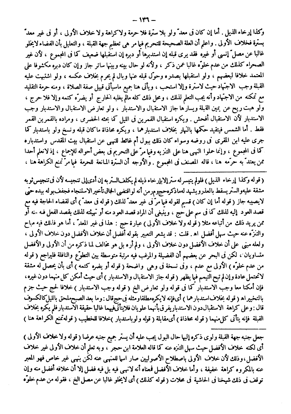 قُلْت: قَدْ يُشْعِرُ التَّعْبِيرُ بِقَوْلِهِ أَفْضَلُ أَنَّ خِلَافَ الْأَفْضَلِ دُونَ خِلَافِ الْأَوْلَى، وَلَعَلَّهُ مَبْنِيٌّ عَلَى أَنَّ خِلَافَ الْأَفْضَلِ دُونَ خِلَافِ الْأَوْلَى، وَلَمْ أَرَهُ بَلْ هُوَ مُخَالِفٌ لِمَا ذَكَرَهُ مِنْ أَنَّ الْأَوْلَى وَالْأَفْضَلَ مُتَسَاوِيَانِ، لَكِنْ فِي الْبَحْرِ عَنْ بَعْضِهِمْ أَنَّ الْفَضِيلَةَ وَالْمُرَغَّبَ فِيهِ مَرْتَبَةٌ مُتَوَسِّطَةٌ بَيْنَ التَّطَوُّعِ وَالنَّافِلَةِ فَلْيُرَاجَعْ (قَوْلُهُ: مِنْ عَدَمِ خُلُوِّهِ) الْأَوْلَى مَعَ عَدَمِ، وَفِي نُسْخَةٍ فِي وَهِيَ وَاضِحَةٌ (قَوْلُهُ أَوْ يَضُرُّهُ كَتْمُهُ) أَيْ بِأَنْ يَحْصُلَ لَهُ مَشَقَّةٌ لَا تُحْتَمَلُ عَادَةً وَإِنْ لَمْ تُبِحْ التَّيَمُّمَ فِيمَا يَظْهَرُ (قَوْلُهُ: جَازَ الِاسْتِقْبَالُ وَالِاسْتِدْبَارُ) أَيْ حَيْثُ أَمْكَنَ كُلٌّ مِنْهُمَا دُونَ غَيْرِهِ، فَإِنْ أَمْكَنَا مَعًا وَجَبَ الِاسْتِدْبَارُ كَمَا فِي قَوْلِهِ وَلَوْ تَعَارَضَ إلَخْ (قَوْلُهُ: وَجَبَ الِاسْتِدْبَارُ) خِلَافًا لحج حَيْثُ جَزَمَ بِالتَّخْيِيرِ اهـ (قَوْلُهُ: بِخِلَافِ اسْتِدْبَارِهِمَا) أَيْ فَإِنَّهُ لَا يُكْرَهُ مُطْلَقًا وَمِثْلُهُ فِي حَجّ قَالَ: وَمَا بَعْدَ الصُّبْحِ مُلْحَقٌ بِاللَّيْلِ كَالْكُسُوفِ قَالَ: وَعَلَى كَرَاهَةِ الِاسْتِقْبَالِ دُونَ الِاسْتِدْبَارِ يُفَرَّقُ بِأَنَّهُمَا عُلْوِيَّانِ فَلَا يَتَأَتَّى فِيهِمَا غَالِبًا حَقِيقَةُ الِاسْتِدْبَارِ فَلَمْ يُكْرَهْ بِخِلَافِ الْقِبْلَةِ فَإِنَّهُ يَتَأَتَّى كُلٌّ مِنْهُمَا (قَوْلُهُ: مُحَاذَاةُ) أَيْ مُقَابَلَةُ (قَوْلُهُ وَلَوْ بِاسْتِدْبَارٍ) خِلَافًا لِلْخَطِيبِ (قَوْلُهُ تُمْنَعُ الْكَرَاهَةُ هُنَا)