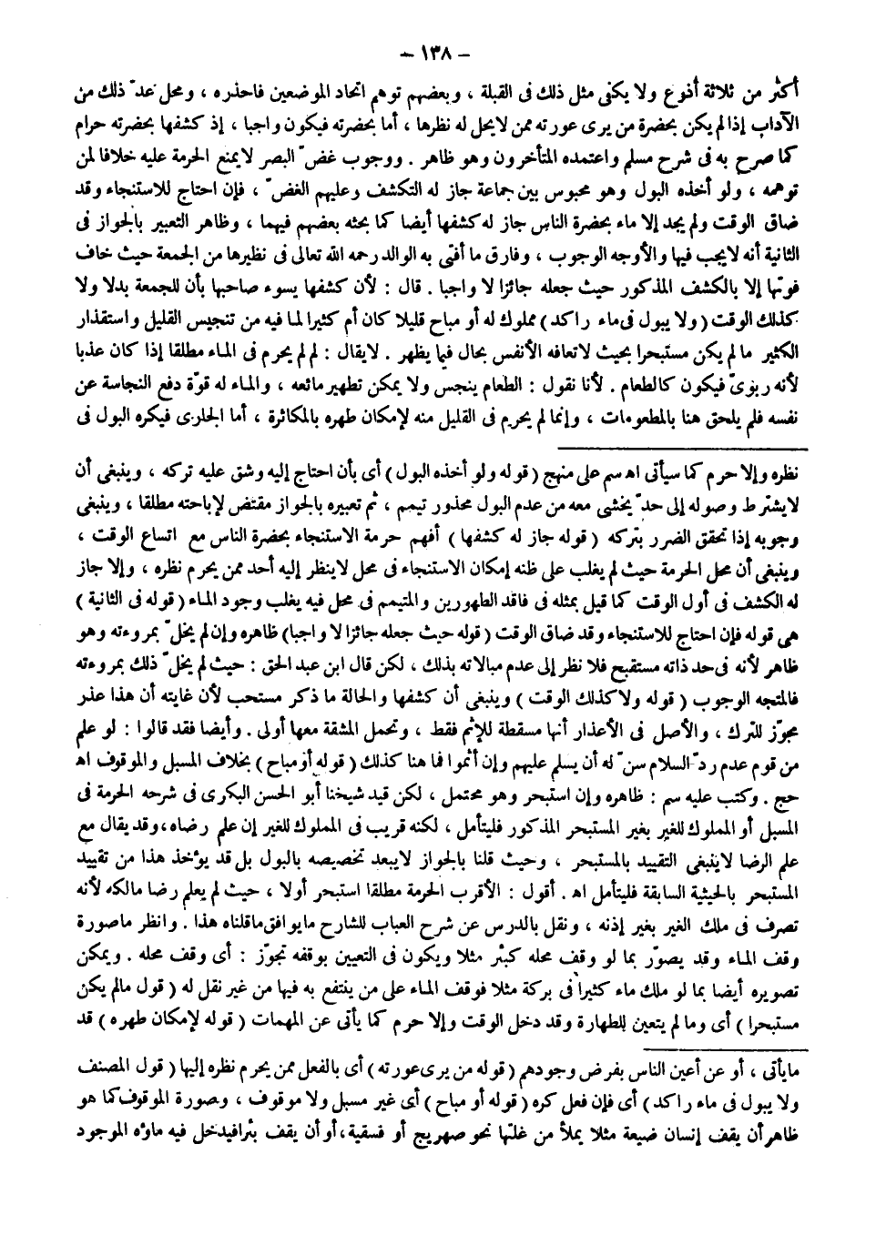 وَكَتَبَ عَلَيْهِ سم: ظَاهِرُهُ وَإِنْ اسْتَبْحَرَ وَهُوَ مُحْتَمَلٌ، لَكِنْ قَيَّدَ شَيْخُنَا أَبُو الْحَسَنِ الْبَكْرِيُّ فِي شَرْحِهِ الْحُرْمَةَ فِي الْمُسَبَّلِ أَوْ الْمَمْلُوكِ لِلْغَيْرِ بِغَيْرِ الْمُسْتَبْحَرِ الْمَذْكُورِ فَلْيُتَأَمَّلْ، لَكِنَّهُ قَرِيبٌ فِي الْمَمْلُوكِ لِلْغَيْرِ إنْ عُلِمَ رِضَاهُ، وَقَدْ يُقَالُ مَعَ عِلْمِ الرِّضَا لَا يَنْبَغِي التَّقْيِيدُ بِالْمُسْتَبْحَرِ، وَحَيْثُ قُلْنَا بِالْجَوَازِ لَا يَبْعُدُ تَخْصِيصُهُ بِالْبَوْلِ بَلْ قَدْ يُؤْخَذُ هَذَا مِنْ تَقْيِيدِ الْمُسْتَبْحَرِ بِالْحَيْثِيَّةِ السَّابِقَةِ فَلْيُتَأَمَّلْ اهـ.