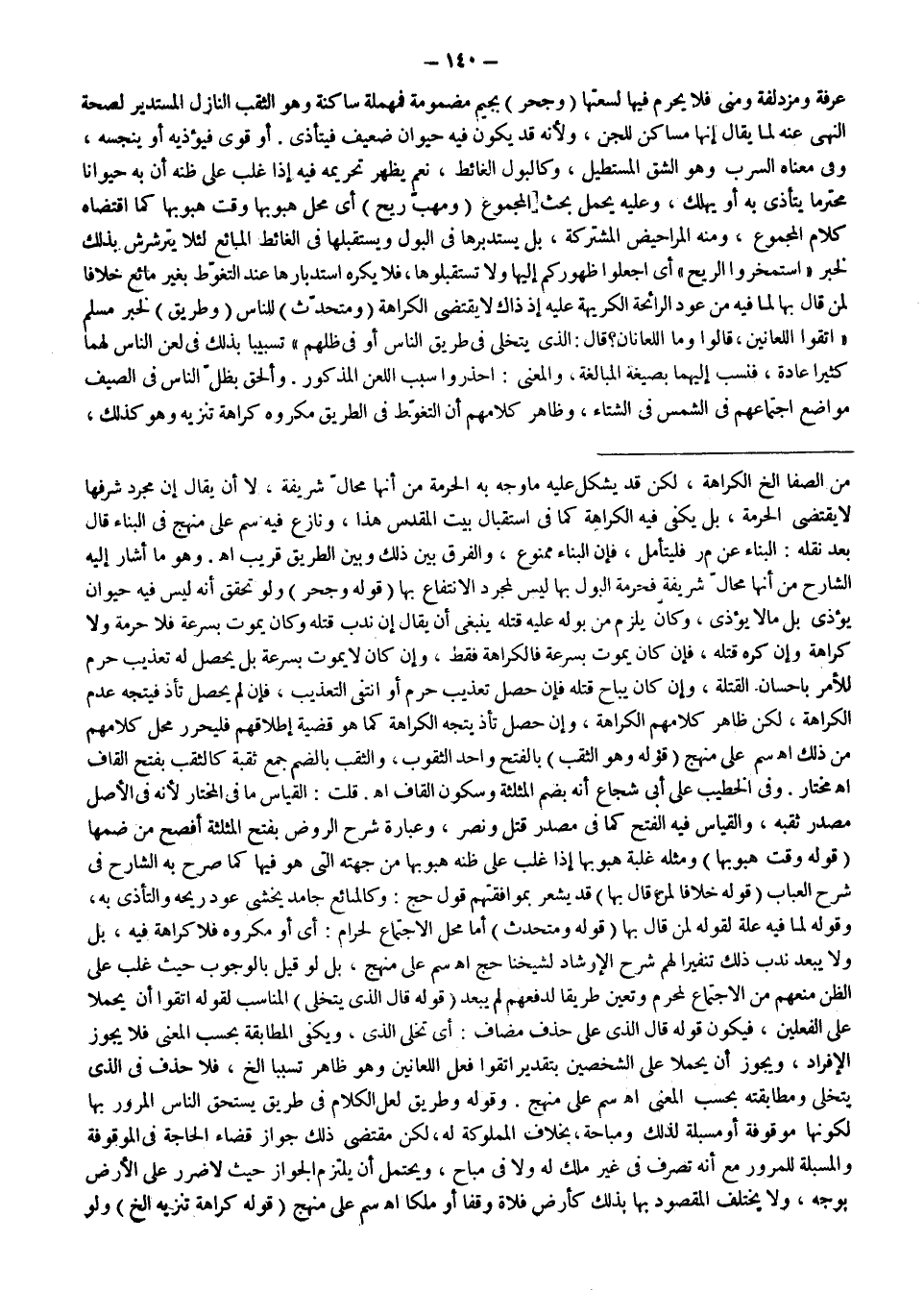 أَوْ قَوِيٌّ فَيُؤْذِيهِ أَوْ يُنَجِّسُهُ، وَفِي مَعْنَاهُ السَّرَبُ وَهُوَ الشِّقُّ الْمُسْتَطِيلُ، وَكَالْبَوْلِ الْغَائِطُ، نَعَمْ يَظْهَرُ تَحْرِيمُهُ فِيهِ إذَا غَلَبَ عَلَى ظَنِّهِ أَنَّ بِهِ حَيَوَانًا مُحْتَرَمًا يَتَأَذَّى بِهِ أَوْ يَهْلِكُ، وَعَلَيْهِ يُحْمَلُ بَحْثُ الْمَجْمُوعِ (وَمَهَبِّ رِيحٍ) أَيْ مَحَلِّ هُبُوبِهَا وَقْتَ هُبُوبِهَا كَمَا اقْتَضَاهُ كَلَامُ الْمَجْمُوعِ، وَمِنْهُ الْمَرَاحِيضُ الْمُشْتَرَكَةُ، بَلْ يَسْتَدْبِرُهَا فِي الْبَوْلِ وَيَسْتَقْبِلُهَا فِي الْغَائِطِ الْمَائِعِ لِئَلَّا يَتَرَشْرَشَ بِذَلِكَ لِخَبَرِ «اسْتَمْخِرُوا الرِّيحَ» أَيْ اجْعَلُوا ظُهُورَكُمْ إلَيْهَا وَلَا تَسْتَقْبِلُوهَا، فَلَا يُكْرَهُ اسْتِدْبَارُهَا عِنْدَ التَّغَوُّطِ بِغَيْرِ مَائِعٍ خِلَافًا لِمَنْ قَالَ بِهَا لِمَا فِيهِ مِنْ عَوْدِ الرَّائِحَةِ الْكَرِيهَةِ عَلَيْهِ إذْ ذَاكَ لَا يَقْتَضِي الْكَرَاهَةَ (وَمُتَحَدَّثٍ) لِلنَّاسِ (وَطَرِيقٍ) لِخَبَرِ. مُسْلِمٍ «اتَّقُوا اللَّعَّانَيْنِ، قَالُوا وَمَا اللَّعَّانَانِ؟ قَالَ: الَّذِي يَتَخَلَّى فِي طَرِيقِ النَّاسِ أَوْ فِي ظِلِّهِمْ» تَسْبِيبًا بِذَلِكَ فِي لَعْنِ النَّاسِ لَهُمَا كَثِيرًا عَادَةً، فَنَسَبَ إلَيْهِمَا بِصِيغَةِ الْمُبَالَغَةِ، وَالْمَعْنَى: احْذَرُوا سَبَبَ اللَّعْنِ الْمَذْكُورِ.