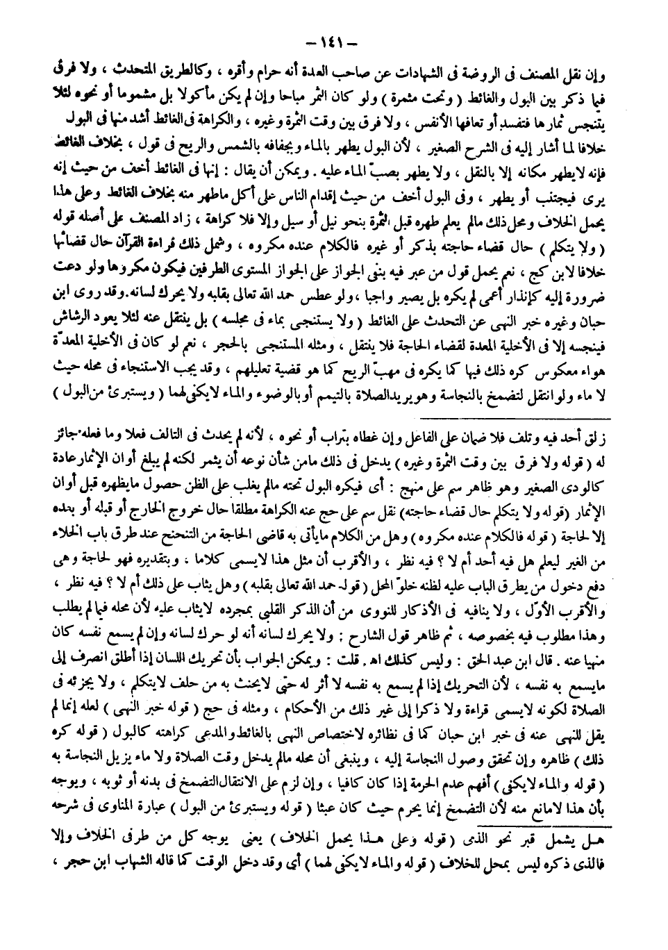 قُلْت: وَيُمْكِنُ الْجَوَابُ بِأَنَّ تَحْرِيكَ اللِّسَانِ إذَا أُطْلِقَ انْصَرَفَ إلَى مَا يُسْمِعُ بِهِ نَفْسَهُ، لِأَنَّ التَّحْرِيكَ إذَا لَمْ يُسْمِعْ بِهِ نَفْسَهُ لَا أَثَرَ لَهُ حَتَّى لَا يَحْنَثَ بِهِ مَنْ حَلَفَ لَا يَتَكَلَّمُ، وَلَا يُجْزِئُهُ فِي الصَّلَاةِ لِكَوْنِهِ لَا يُسَمَّى قِرَاءَةً وَلَا ذِكْرًا إلَى غَيْرِ ذَلِكَ مِنْ الْأَحْكَامِ، وَمِثْلُهُ فِي حَجّ (قَوْلُهُ خَبَرَ النَّهْيِ) لَعَلَّهُ إنَّمَا لَمْ يَقُلْ لِلنَّهْيِ عَنْهُ فِي خَبَرِ ابْنِ حِبَّانَ كَمَا فِي نَظَائِرِهِ لِاخْتِصَاصِ النَّهْيِ بِالْغَائِطِ وَالْمُدَّعَى كَرَاهَتُهُ كَالْبَوْلِ