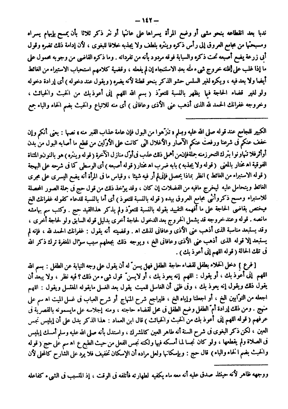 وَقَضِيَّتُهُ أَنَّهُ يَقُولُ: غُفْرَانَك الْحَمْدُ لِلَّهِ، فَإِنَّهُ لَمْ يَسْتَبْعِدْ إلَّا قَوْلَهُ الَّذِي أَذْهَبَ عَنِّي الْأَذَى وَعَافَانِي إلَخْ، وَيُوَجَّهُ ذَلِكَ بِجَعْلِهِمْ سَبَبَ سُؤَالِ الْمَغْفِرَةِ تَرْكَ ذِكْرِ اللَّهِ فِي تِلْكَ الْحَالَةِ (قَوْلُهُ اللَّهُمَّ إنِّي أَعُوذُ بِك) . [فَرْعٌ] دَخَلَ الْخَلَاءَ بِطِفْلٍ لِقَضَاءِ حَاجَةِ الطِّفْلِ فَهَلْ يُسَنُّ لَهُ أَنْ يَقُولَ عَلَى وَجْهِ النِّيَابَةِ عَنْ الطِّفْلِ: بِسْمِ اللَّهِ اللَّهُمَّ إنِّي أَعُوذُ بِك، أَوْ يَقُولُ: اللَّهُمَّ إنَّهُ يَعُوذُ بِك، أَوْ لَا يُسَنُّ قَوْلُ شَيْءٍ مِنْ ذَلِكَ؟ فِيهِ نَظَرٌ، وَلَا يَبْعُدُ أَنْ يَقُولَ ذَلِكَ وَيَقُولَ إنَّهُ يَعُوذُ بِك، وَفِي ظَنِّي أَنَّ الْغَاسِلَ لِلْمَيِّتِ يَقُولُ بَعْدَ الْغُسْلِ مَا يَقُولُهُ الْمُغْتَسِلُ وَيَقُولُ: اللَّهُمَّ اجْعَلْهُ مِنْ التَّوَّابِينَ إلَخْ، أَوْ اجْعَلْنَا وَإِيَّاهُ إلَخْ، فَلْيُرَاجَعْ شَرْحُ الْمِنْهَاجِ أَوْ شَرْحُ الْعُبَابِ فِي غُسْلِ الْمَيِّتِ اهـ سم عَلَى مَنْهَجٍ.