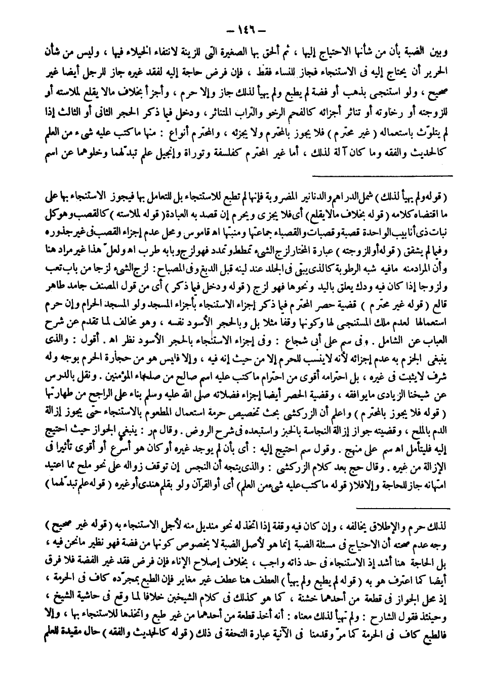 وَبَيْنَ الضَّبَّةِ بِأَنَّ مِنْ شَأْنِهَا الِاحْتِيَاجُ إلَيْهَا، ثُمَّ أَلْحَقَ بِهَا الصَّغِيرَةَ الَّتِي لِلزِّينَةِ لِانْتِفَاءِ الْخُيَلَاءِ فِيهَا، وَلَيْسَ مِنْ شَأْنِ الْحَرِيرِ أَنْ يُحْتَاجَ إلَيْهِ فِي الِاسْتِنْجَاءِ فَجَازَ لِلنِّسَاءِ فَقَطْ، فَإِنْ فُرِضَ حَاجَةٌ إلَيْهِ لِفَقْدِ غَيْرِهِ جَازَ لِلرَّجُلِ أَيْضًا غَيْرُ صَحِيحٍ، وَلَوْ اسْتَنْجَى بِذَهَبٍ أَوْ فِضَّةٍ لَمْ يُطْبَعْ وَلَمْ يُهَيَّأْ لِذَلِكَ جَازَ وَإِلَّا حَرُمَ، وَأَجْزَأَ بِخِلَافِ مَا لَا يَقْلَعُ لِمَلَاسَتِهِ أَوْ لِلُزُوجَتِهِ أَوْ رَخَاوَتِهِ أَوْ تَنَاثُرِ أَجْزَائِهِ كَالْفَحْمِ الرَّخْوِ وَالتُّرَابِ الْمُتَنَاثِرِ، وَدَخَلَ فِيمَا ذُكِرَ الْحَجَرُ الثَّانِي أَوْ الثَّالِثُ إذَا لَمْ يَتَلَوَّثْ بِاسْتِعْمَالِهِ (غَيْرِ مُحْتَرَمٍ) فَلَا يَجُوزُ بِالْمُحْتَرَمِ وَلَا يُجْزِئُهُ، وَالْمُحْتَرَمُ أَنْوَاعٌ: مِنْهَا مَا كُتِبَ عَلَيْهِ شَيْءٌ مِنْ الْعِلْمِ كَالْحَدِيثِ وَالْفِقْهِ وَمَا كَانَ آلَةً لِذَلِكَ، أَمَّا غَيْرُ الْمُحْتَرَمِ كَفَلْسَفَةٍ وَتَوْرَاةٍ وَإِنْجِيلٍ عَلِمَ تَبَدُّلَهُمَا وَخُلُوَّهُمَا عَنْ اسْمٍ