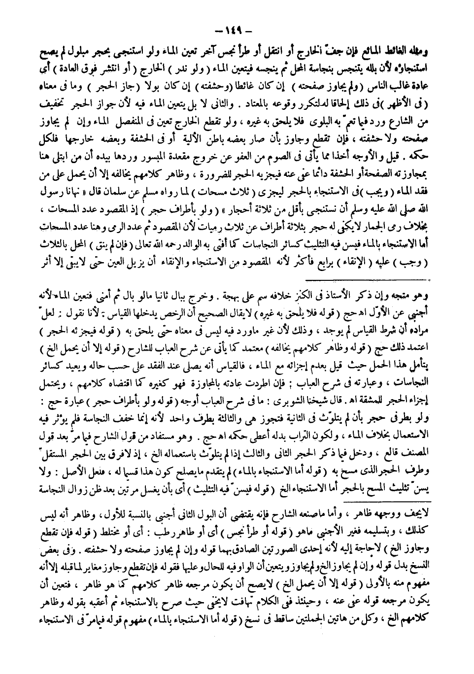 قِيلَ وَالْأَوْجَهُ أَخْذًا مِمَّا يَأْتِي فِي الصَّوْمِ مِنْ الْعَفْوِ عَنْ خُرُوجِ مَقْعَدَةِ الْمَبْسُورِ وَرَدِّهَا بِيَدِهِ أَنَّ مَنْ اُبْتُلِيَ هُنَا بِمُجَاوَزَتِهِ الصَّفْحَةَ أَوْ الْحَشَفَةَ دَائِمًا عُفِيَ عَنْهُ فَيُجْزِيهِ الْحَجَرُ لِلضَّرُورَةِ، وَظَاهِرُ كَلَامِهِمْ يُخَالِفُهُ إلَّا أَنْ يُحْمَلَ عَلَى مَنْ فَقَدَ الْمَاءَ (وَيَجِبُ) فِي الِاسْتِنْجَاءِ بِالْحَجَرِ لِيُجْزِيَ (ثَلَاثُ مَسَحَاتٍ) لِمَا رَوَاهُ مُسْلِمٌ عَنْ سَلْمَانَ قَالَ «نَهَانَا رَسُولُ اللَّهِ - صَلَّى اللَّهُ عَلَيْهِ وَسَلَّمَ - أَنْ نَسْتَنْجِيَ بِأَقَلَّ مِنْ ثَلَاثَةِ أَحْجَارٍ» (وَلَوْ بِأَطْرَافِ حَجَرٍ) إذْ الْمَقْصُودُ عَدَدُ الْمَسَحَاتِ، بِخِلَافِ رَمْيِ الْجِمَارِ لَا يَكْفِي لَهُ حَجَرٌ بِثَلَاثَةِ أَطْرَافٍ عَنْ ثَلَاثِ رَمَيَاتٍ لِأَنَّ الْمَقْصُودَ ثَمَّ عَدَدُ الرَّمْيِ وَهُنَا عَدَدُ الْمَسَحَاتِ