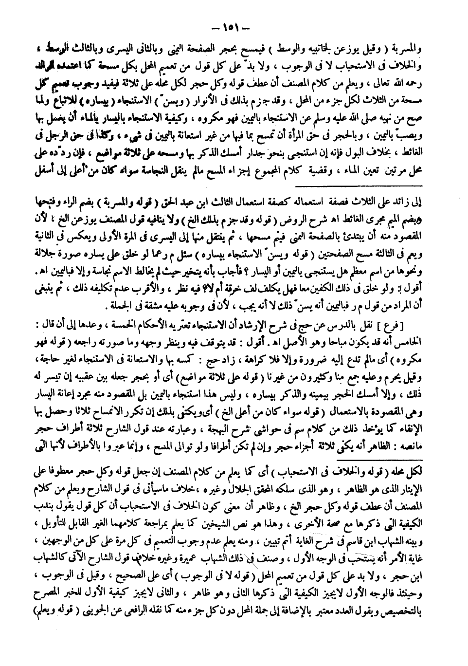 ـــــــــــــــــــــــــــــSإلَى زَائِدٍ عَلَى الثَّلَاثِ فَصِفَةُ اسْتِعْمَالِهِ كَصِفَةِ اسْتِعْمَالِ الثَّالِثِ ابْنُ عَبْدِ الْحَقِّ (قَوْلُهُ وَالْمُسْرَبَةِ) بِضَمِّ الرَّاءِ وَفَتْحِهَا وَبِضَمِّ الْمِيمِ مَجْرَى الْغَائِطِ اهـ شَرْحُ الرَّوْضِ (قَوْلُهُ: وَقَدْ جَزَمَ بِذَلِكَ إلَخْ) وَلَا يُنَافِيهِ قَوْلُ الْمُصَنِّفِ يُوَزَّعْنَ إلَخْ، لِأَنَّ الْمَقْصُودَ مِنْهُ أَنْ يَبْتَدِئَ بِالصَّفْحَةِ الْيُمْنَى فَيُتِمَّ مَسْحَهَا، ثُمَّ يَنْتَقِلَ مِنْهَا إلَى الْيُسْرَى فِي الْمَرَّةِ الْأُولَى وَيَعْكِسَ فِي الثَّانِيَةِ وَيَعُمَّ فِي الثَّالِثَةِ مَسْحَ الصَّفْحَتَيْنِ (قَوْلُهُ: وَيُسَنُّ الِاسْتِنْجَاءُ بِيَسَارِهِ) سُئِلَ م ر عَمَّا لَوْ خُلِقَ عَلَى يَسَارِهِ صُورَةُ جَلَالَةٍ وَنَحْوِهَا مِنْ اسْمٍ مُعَظَّمٍ هَلْ يَسْتَنْجِي بِالْيَمِينِ أَوْ الْيَسَارِ؟ فَأَجَابَ بِأَنَّهُ يَتَخَيَّرُ حَيْثُ لَمْ يُخَالِطْ الِاسْمَ نَجَاسَةٌ وَإِلَّا فَبِالْيَمِينِ اهـ.