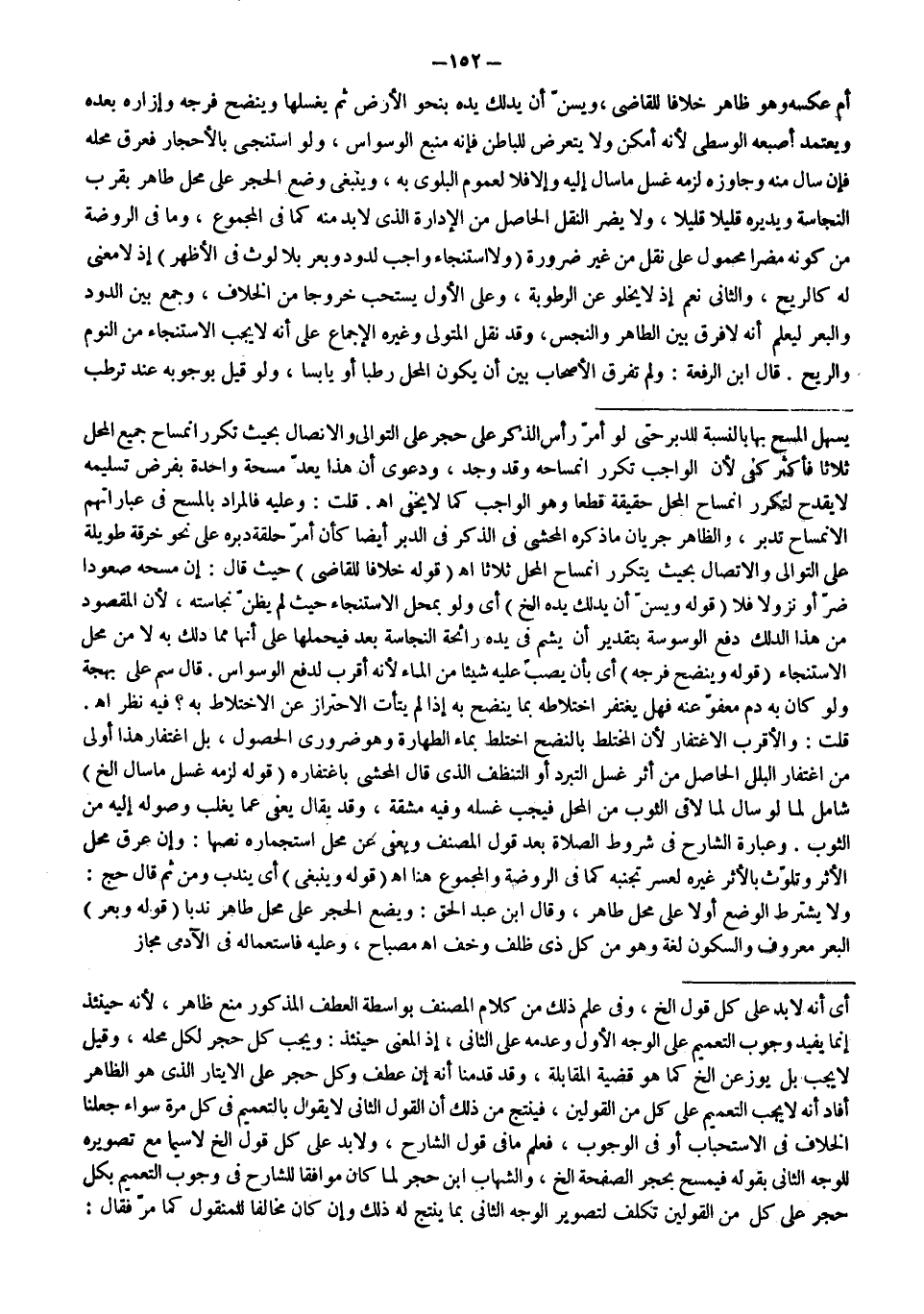 ـــــــــــــــــــــــــــــSيَسْهُلُ الْمَسْحُ بِهَا بِالنِّسْبَةِ لِلدُّبُرِ حَتَّى لَوْ أَمَرَّ رَأْسَ الذَّكَرِ عَلَى حَجَرٍ عَلَى التَّوَالِي وَالِاتِّصَالِ بِحَيْثُ تَكَرَّرَ انْمِسَاحُ جَمِيعِ الْمَحَلِّ ثَلَاثًا فَأَكْثَرَ كَفَى لِأَنَّ الْوَاجِبَ تَكَرُّرُ انْمِسَاحِهِ وَقَدْ وُجِدَ، وَدَعْوَى أَنَّ هَذَا يُعَدُّ مَسْحَةً وَاحِدَةً بِفَرْضِ تَسْلِيمِهِ لَا يَقْدَحُ لِتَكَرُّرِ انْمِسَاحِ الْمَحَلِّ حَقِيقَةً قَطْعًا وَهُوَ الْوَاجِبُ كَمَا لَا يَخْفَى اهـ.