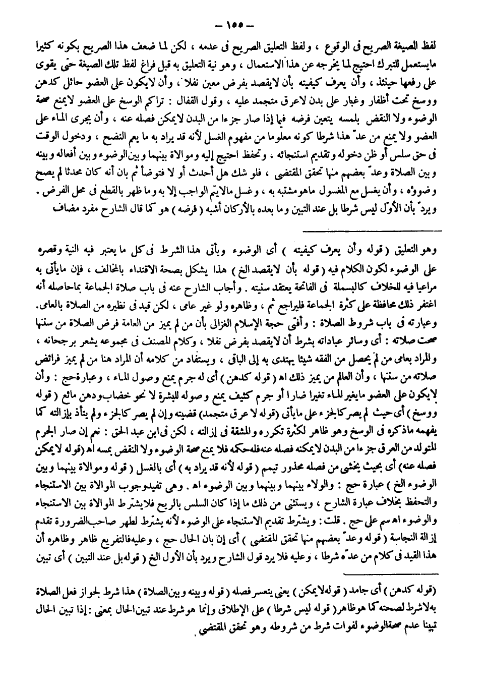 وَأَجَابَ الشَّارِحُ عَنْهُ فِي بَابِ صَلَاةِ الْجَمَاعَةِ بِمَا حَاصِلُهُ أَنَّهُ اُغْتُفِرَ ذَلِكَ مُحَافَظَةً عَلَى كَثْرَةِ الْجَمَاعَةِ فَلْيُرَاجَعْ ثَمَّ، وَظَاهِرُهُ وَلَوْ غَيْرَ عَامِّيٍّ، لَكِنْ قُيِّدَ فِي نَظِيرِهِ مِنْ الصَّلَاةِ بِالْعَامِّيِّ. وَعِبَارَتُهُ فِي بَابِ شُرُوطِ الصَّلَاةِ: وَأَفْتَى حُجَّةُ الْإِسْلَامِ الْغَزَالِيُّ بِأَنَّ مَنْ لَمْ يُمَيِّزْ مِنْ الْعَامَّةِ فَرْضَ الصَّلَاةِ مِنْ سُنَنِهَا صَحَّتْ صَلَاتُهُ: أَيْ وَسَائِرُ عِبَادَاتِهِ بِشَرْطِ أَنْ لَا يَقْصِدَ بِفَرْضٍ نَفْلًا، وَكَلَامُ الْمُصَنِّفِ فِي مَجْمُوعِهِ يُشْعِرُ بِرُجْحَانِهِ، وَالْمُرَادُ بِعَامِّيٍّ مَنْ لَمْ يُحَصِّلْ مِنْ الْفِقْهِ شَيْئًا يَهْتَدِي بِهِ إلَى الْبَاقِي، وَيُسْتَفَادُ مِنْ كَلَامِهِ أَنَّ الْمُرَادَ هُنَا مَنْ لَمْ يُمَيِّزْ فَرَائِضَ صَلَاتِهِ مِنْ سُنَنِهَا، وَأَنَّ الْعَالِمَ مَنْ يُمَيِّزُ ذَلِكَ اهـ (قَوْلُهُ: كَدُهْنٍ) أَيْ لَهُ جِرْمٌ يَمْنَعُ وُصُولَ الْمَاءِ، وَعِبَارَةُ حَجّ: وَأَنْ لَا يَكُونَ عَلَى الْعُضْوِ مَا يُغَيِّرُ الْمَاءَ تَغَيُّرًا ضَارًّا أَوْ جِرْمٌ كَثِيفٌ يَمْنَعُ وُصُولَهُ لِلْبَشَرَةِ لَا نَحْوُ خِضَابٍ وَدُهْنٍ مَائِعٍ (قَوْلُهُ: وَوَسَخٍ) أَيْ حَيْثُ لَمْ يَصِرْ كَالْجُزْءِ عَلَى مَا يَأْتِي (قَوْلُهُ: لَا عَرَقٍ مُتَجَمِّدٍ) قَضِيَّتُهُ وَإِنْ لَمْ يَصِرْ كَالْجُزْءِ وَلَمْ يَتَأَذَّ بِإِزَالَتِهِ كَمَا يَفْهَمُهُ مَا ذَكَرَهُ فِي الْوَسَخِ وَهُوَ ظَاهِرٌ لِكَثْرَةِ تَكَرُّرِهِ وَالْمَشَقَّةِ فِي إزَالَتِهِ، لَكِنْ فِي ابْنِ عَبْدِ الْحَقِّ: نَعَمْ إنْ صَارَ الْجِرْمُ الْمُتَوَلِّدُ مِنْ الْعَرَقِ جُزْءًا مِنْ الْبَدَنِ لَا يُمْكِنُهُ فَصْلُهُ عَنْهُ فَلَهُ حُكْمُهُ فَلَا يَمْنَعُ صِحَّةَ الْوُضُوءِ وَلَا النَّقْضُ بِمَسِّهِ اهـ (قَوْلُهُ لَا يُمْكِنُ فَصْلُهُ عَنْهُ) أَيْ بِحَيْثُ يَخْشَى مِنْ فَصْلِهِ مَحْذُورَ تَيَمُّمٍ (قَوْلُهُ: لِأَنَّهُ قَدْ يُرَادُ بِهِ) أَيْ بِالْغَسْلِ (قَوْلُهُ: وَمُوَالَاةٍ بَيْنَهُمَا وَبَيْنَ الْوُضُوءِ إلَخْ) عِبَارَةُ حَجّ: وَالْوَلَاءُ بَيْنَهُمَا وَبَيْنَهُمَا وَبَيْنَ الْوُضُوءِ اهـ.