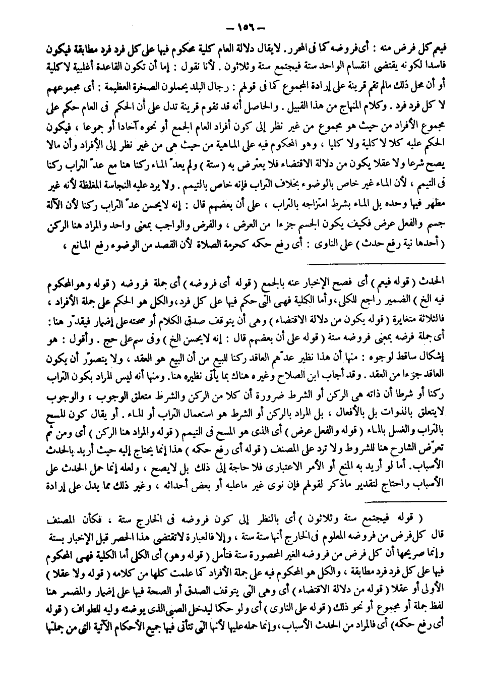ـــــــــــــــــــــــــــــQقَوْلُهُ: فَيَجْتَمِعُ سِتَّةٌ وَثَلَاثُونَ) أَيْ بِالنَّظَرِ إلَى كَوْنِ فُرُوضِهِ فِي الْخَارِجِ سِتَّةً، فَكَأَنَّ الْمُصَنِّفَ قَالَ كُلُّ فَرْضٍ مِنْ فُرُوضِهِ الْمَعْلُومِ فِي الْخَارِجِ أَنَّهَا سِتَّةٌ سِتَّةٌ، وَإِلَّا فَالْعِبَارَةُ لَا تَقْتَضِي هَذَا الْحَصْرَ قَبْلَ الْإِخْبَارِ بِسِتَّةٍ وَإِنَّمَا صَرِيحُهَا أَنَّ كُلَّ فَرْضٍ مِنْ فُرُوضِهِ الْغَيْرِ الْمَحْصُورَةِ سِتَّةٌ فَتَأَمَّلْ (قَوْلُهُ: وَهُوَ) أَيْ الْكُلِّيُّ أَمَّا الْكُلِّيَّةُ فَهِيَ الْمَحْكُومُ فِيهَا عَلَى كُلِّ فَرْدٍ فَرْدٍ مُطَابَقَةً، وَالْكُلُّ هُوَ الْمَحْكُومُ فِيهِ عَلَى جُمْلَةِ الْأَفْرَادِ كَمَا عُلِمَتْ كُلُّهَا مِنْ كَلَامِهِ (قَوْلُهُ: وَلَا عَقْلًا) الْأَوْلَى أَوْ عَقْلًا (قَوْلُهُ: مِنْ دَلَالَةِ الِاقْتِضَاءِ) أَيْ وَهِيَ الَّتِي يَتَوَقَّفُ الصِّدْقُ أَوْ الصِّحَّةُ فِيهَا عَلَى إضْمَارٍ، وَالْمُضْمَرُ هُنَا لَفْظُ جُمْلَةٍ أَوْ مَجْمُوعٍ أَوْ نَحْوُ ذَلِكَ (قَوْلُهُ: عَلَى النَّاوِي) أَيْ وَلَوْ حُكْمًا لِيَدْخُلَ الصَّبِيُّ الَّذِي يُوَضِّئُهُ وَلِيُّهُ لِلطَّوَافِ (قَوْلُهُ: أَيْ رَفْعُ حُكْمِهِ) أَيْ فَالْمُرَادُ مِنْ الْحَدَثِ الْأَسْبَابُ، وَإِنَّمَا حَمَلَهُ عَلَيْهَا؛ لِأَنَّهَا الَّتِي تَتَأَتَّى فِيهَا جَمِيعُ الْأَحْكَامِ الْآتِيَةِ الَّتِي مِنْ جُمْلَتِهَا