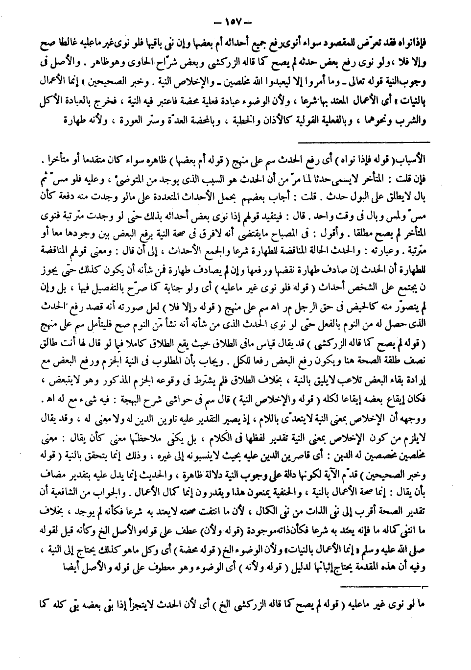 وَعِبَارَتُهُ: وَالْحَدَثُ الْحَالَةُ الْمُنَاقِضَةُ لِلطَّهَارَةِ شَرْعًا وَالْجَمْعُ الْأَحْدَاثُ، إلَى أَنْ قَالَ: وَمَعْنَى قَوْلِهِمْ الْمُنَاقِضَةُ لِلطَّهَارَةِ أَنَّ الْحَدَثَ إنْ صَادَفَ طَهَارَةً نَقَضَهَا وَرَفَعَهَا وَإِنْ لَمْ يُصَادِفْ طَهَارَةً فَمِنْ شَأْنِهِ أَنْ يَكُونَ كَذَلِكَ حَتَّى يَجُوزَ أَنْ يَجْتَمِعَ عَلَى الشَّخْصِ أَحْدَاثٌ (قَوْلُهُ: فَلَوْ نَوَى غَيْرَ مَا عَلَيْهِ) أَيْ وَلَوْ جَنَابَةً كَمَا صَرَّحَ بِالتَّفْصِيلِ فِيهَا، بَلْ وَإِنْ لَمْ يُتَصَوَّرْ مِنْهُ كَالْحَيْضِ فِي حَقِّ الرَّجُلِ م ر اهـ سم عَلَى مَنْهَجٍ (قَوْلُهُ: وَإِلَّا فَلَا) لَعَلَّ صُورَتَهُ أَنَّهُ قَصَدَ رَفْعَ الْحَدَثِ الَّذِي حَصَلَ لَهُ مِنْ النَّوْمِ بِالْفِعْلِ حَتَّى لَوْ نَوَى الْحَدَثَ الَّذِي مِنْ شَأْنِهِ أَنَّهُ نَشَأَ مِنْ النَّوْمِ صَحَّ فَلْيُتَأَمَّلْ سم عَلَى مَنْهَجٍ (قَوْلُهُ: لَمْ يَصِحَّ كَمَا قَالَهُ الزَّرْكَشِيُّ) قَدْ يُقَالُ قِيَاسُ مَا فِي الطَّلَاقِ حَيْثُ يَقَعُ الطَّلَاقُ كَامِلًا فِيمَا لَوْ قَالَ لَهَا أَنْتِ طَالِقٌ نِصْفَ طَلْقَةٍ الصِّحَّةُ هُنَا وَيَكُونُ رَفْعُ الْبَعْضِ رَفْعًا لِلْكُلِّ.