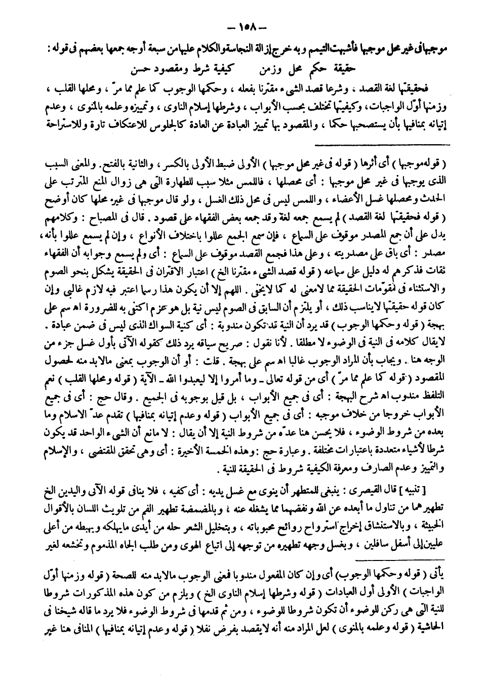 اللَّهُمَّ إلَّا أَنْ يَكُونَ هَذَا رَسْمًا اُعْتُبِرَ فِيهِ لَازِمٌ غَالِبِيٌّ وَإِنْ كَانَ قَوْلُهُ حَقِيقَتُهَا لَا يُنَاسِبُ ذَلِكَ، أَوْ يَلْتَزِمُ أَنَّ السَّابِقَ فِي الصَّوْمِ لَيْسَ كَنِيَّةٍ بَلْ هُوَ عَزْمٌ اكْتَفَى بِهِ لِلضَّرُورَةِ اهـ سم عَلَى بَهْجَةٍ (قَوْلُهُ: وَحُكْمُهَا الْوُجُوبُ) قَدْ يُرَدُّ أَنَّ النِّيَّةَ قَدْ تَكُونُ مَنْدُوبَةً: أَيْ كَنِيَّةِ السِّوَاكِ الَّذِي لَيْسَ فِي ضِمْنِ عِبَادَةٍ.
