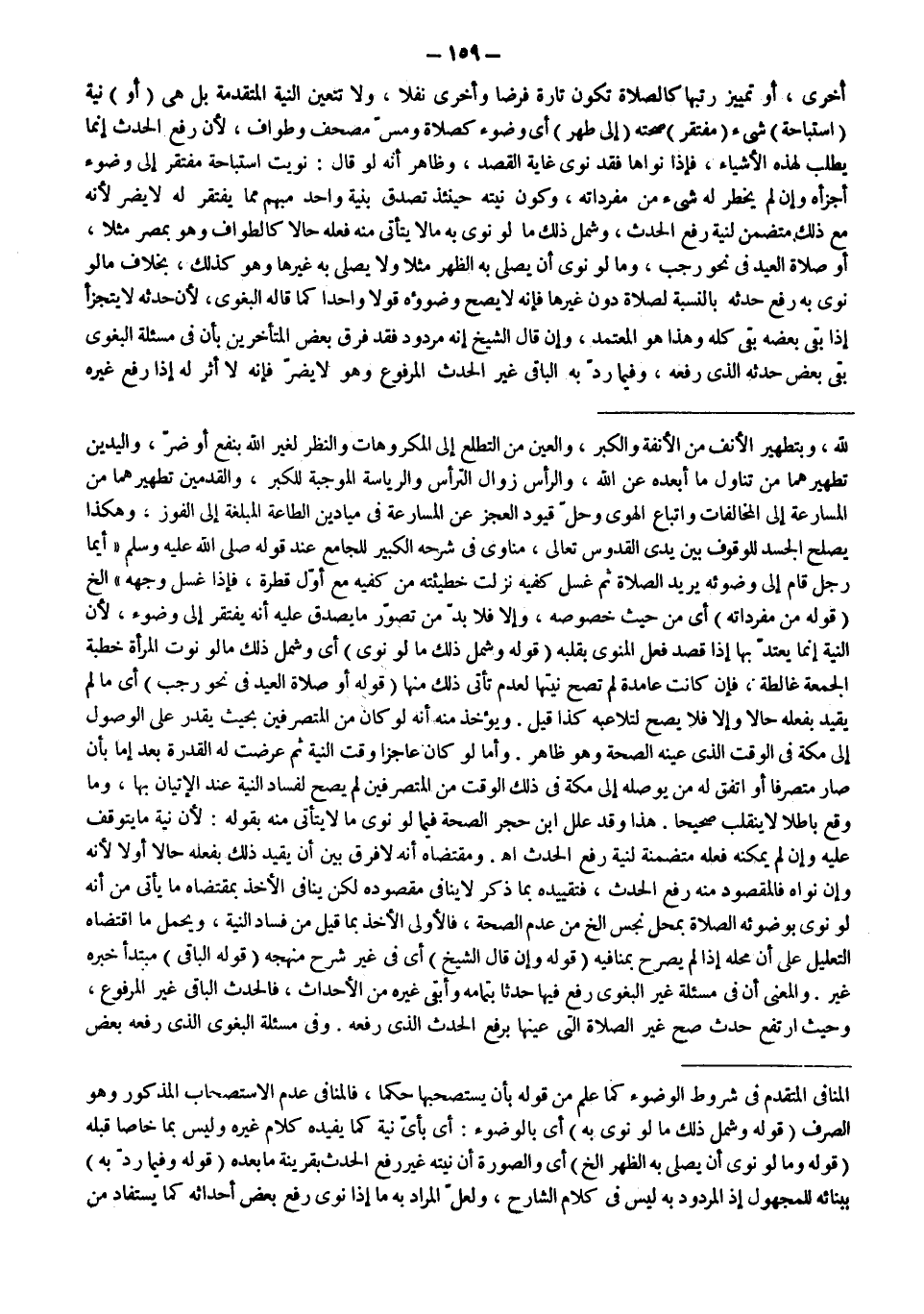 أُخْرَى، أَوْ تَمْيِيزُ رُتَبِهَا كَالصَّلَاةِ تَكُونُ تَارَةً فَرْضًا وَأُخْرَى نَفْلًا، وَلَا تَتَعَيَّنُ النِّيَّةُ الْمُتَقَدِّمَةُ بَلْ هِيَ (أَوْ) نِيَّةُ (اسْتِبَاحَةِ) شَيْءٍ (مُفْتَقِرٍ) صِحَّتُهُ (إلَى طُهْرٍ) أَيْ وُضُوءِ كَصَلَاةٍ وَمَسِّ مُصْحَفٍ وَطَوَافٍ، لِأَنَّ رَفْعَ الْحَدَثِ إنَّمَا يُطْلَبُ لِهَذِهِ الْأَشْيَاءِ، فَإِذَا نَوَاهَا فَقَدْ نَوَى غَايَةَ الْقَصْدِ، وَظَاهِرٌ أَنَّهُ لَوْ قَالَ: نَوَيْت اسْتِبَاحَةَ مُفْتَقِرٍ إلَى وُضُوءٍ أَجْزَأَهُ وَإِنْ لَمْ يَخْطِرْ لَهُ شَيْءٌ مِنْ مُفْرَدَاتِهِ، وَكَوْنُ نِيَّتِهِ حِينَئِذٍ تَصْدُقُ بِنِيَّةِ وَاحِدٍ مُبْهَمٍ مِمَّا يَفْتَقِرُ لَهُ لَا يَضُرُّ لِأَنَّهُ مَعَ ذَلِكَ مُتَضَمِّنٌ لِنِيَّةِ رَفْعِ الْحَدَثِ، وَشَمِلَ ذَلِكَ مَا لَوْ نَوَى بِهِ مَا لَا يَتَأَتَّى مِنْهُ فِعْلُهُ حَالًا كَالطَّوَافِ وَهُوَ بِمِصْرَ مَثَلًا، أَوْ صَلَاةِ الْعِيدِ فِي نَحْوِ رَجَبٍ، وَمَا لَوْ نَوَى أَنْ يُصَلِّيَ بِهِ الظُّهْرَ مَثَلًا وَلَا يُصَلِّيَ بِهِ غَيْرَهَا وَهُوَ كَذَلِكَ، بِخِلَافِ مَا لَوْ نَوَى بِهِ رَفْعَ حَدَثِهِ بِالنِّسْبَةِ لِصَلَاةٍ دُونَ غَيْرِهَا فَإِنَّهُ لَا يَصِحُّ وُضُوءُهُ قَوْلًا وَاحِدًا كَمَا قَالَهُ الْبَغَوِيّ، لِأَنَّ حَدَثَهُ لَا يَتَجَزَّأُ إذَا بَقِيَ بَعْضُهُ بَقِيَ كُلُّهُ وَهَذَا هُوَ الْمُعْتَمَدُ، وَإِنْ قَالَ الشَّيْخُ إنَّهُ مَرْدُودٌ فَقَدْ فَرَّقَ بَعْضُ الْمُتَأَخِّرِينَ بِأَنَّ فِي مَسْأَلَةِ الْبَغَوِيّ بَقِيَ بَعْضُ حَدَثِهِ الَّذِي رَفَعَهُ، وَفِيمَا رَدَّ بِهِ الْبَاقِيَ غَيْرَ الْحَدَثِ الْمَرْفُوعِ وَهُوَ لَا يَضُرُّ فَإِنَّهُ لَا أَثَرَ لَهُ إذَا رَفَعَ غَيْرَهُ