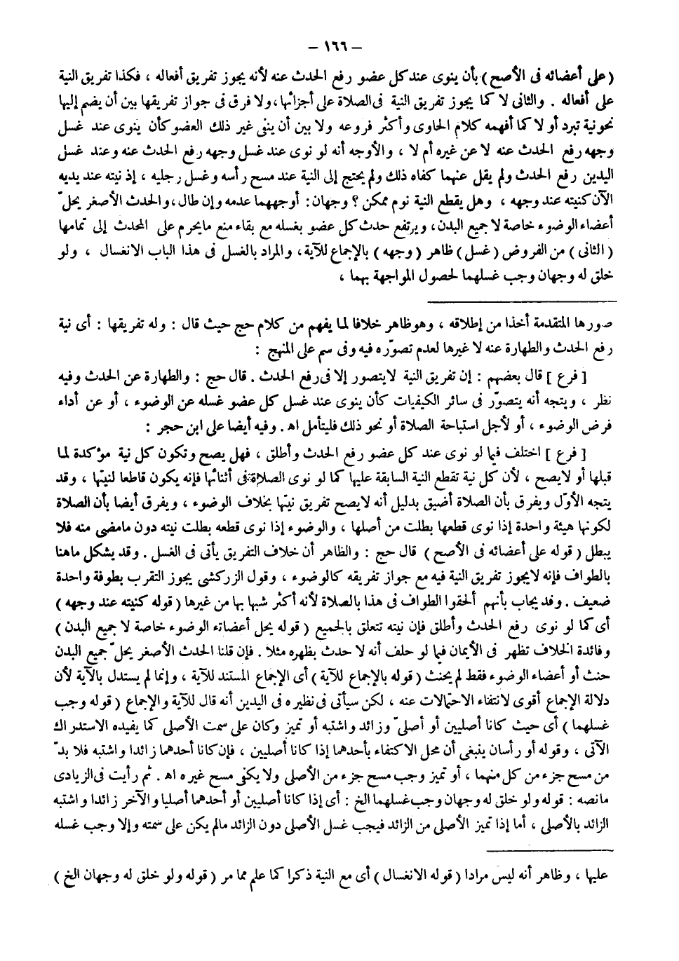 قَالَ حَجّ: وَالطَّهَارَةِ عَنْ الْحَدَثِ وَفِيهِ نَظَرٌ، وَيَتَّجِهُ أَنَّهُ يُتَصَوَّرُ فِي سَائِرِ الْكَيْفِيَّاتِ كَأَنْ يَنْوِيَ عِنْدَ غَسْلِ كُلِّ عُضْوٍ غَسْلَهُ عَنْ الْوُضُوءِ، أَوْ عَنْ أَدَاءِ فَرْضِ الْوُضُوءِ، أَوْ لِأَجْلِ اسْتِبَاحَةِ الصَّلَاةِ أَوْ نَحْوَ ذَلِكَ فَلْيُتَأَمَّلْ اهـ.