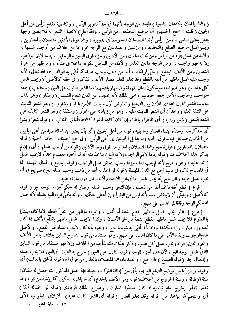 وَفِي حَجّ الْجَبِينَانِ: جَانِبَا الْجَبْهَةِ (قَوْلُهُ مُتَّصِلَانِ بِالْعِذَارَيْنِ) عِبَارَةُ حَجّ وَهُمَا الْمُتَّصِلَانِ بِالْعِذَارِ مِنْ فَوْقِ وَتَدِ الْأُذُنَيْنِ (قَوْلُهُ مَنْ أَوْجَبَ غَسْلَهَا) أَيْ وَإِنْ لَمْ يُذْكَرْ هَذَا الْخِلَافُ هُنَا (قَوْلُهُ: إذْ مَا لَا يَتِمُّ الْوَاجِبُ إلَّا بِهِ إلَخْ) يُؤْخَذُ مِنْهُ أَنَّهُ لَوْ أَخْبَرَهُ مَعْصُومٌ بِحَدِّهِ لَا يَجِبُ غَسْلُ زَائِدٍ عَلَيْهِ، وَهُوَ وَاضِحٌ لِأَنَّهُ لَمْ يَجِبْ لِذَاتِهِ وَإِنَّمَا وَجَبَ لِتَحَقُّقِ غَسْلِ الْوَاجِبِ (قَوْلُهُ: بِالْجَدْعِ) بِالدَّالِ الْمُهْمَلَةِ كَمَا فِي الْمِصْبَاحِ ذَكَرَهُ فِي بَابِ الْجِيمِ مَعَ الدَّالِ الْمُهْمَلَةِ (قَوْلُهُ: لَوْ اتَّخَذَ لَهُ أَنْفًا مِنْ ذَهَبٍ وَجَبَ غَسْلُهُ إلَخْ) صَرِيحٌ فِي أَنَّهُ يَجِبُ غَسْلُ جَمِيعِهِ وَقَالَ حَجّ إنَّمَا يَجِبُ غَسْلُ مَا فِي مَحَلِّ الِالْتِحَامِ لِأَنَّهُ الْبَدَلُ دُونَ مَا زَادَ عَلَيْهِ. [فَرْعٌ] قُطِعَ أَنْفُهُ فَاِتَّخَذَ أَنْفًا مِنْ ذَهَبٍ، فَإِنْ الْتَحَمَ وَجَبَ غَسْلُهُ وَصَارَ لَهُ حُكْمُ أَجْزَاءِ الْوَجْهِ م ر (قَوْلُهُ كَالْأَصْلِيِّ) وَيَنْبَغِي أَنْ لَا يَنْقَضِيَ مَسُّهُ لِأَنَّهُ لَيْسَ مِنْ الْبَشَرَةِ وَإِنْ أُعْطِيَ حُكْمَهَا، وَأَنَّهُ يَكْفِي قَرْنُ النِّيَّةِ بِغَسْلٍ لِأَنَّهُ صَارَ لَهُ حُكْمُ الْوَجْهِ وِفَاقًا لمر اهـ سم عَلَى مَنْهَجٍ. [فَرْعٌ] قَالُوا يَجِبُ غَسْلُ مَا ظَهَرَ بِقَطْعِ شَفَةٍ أَوْ أَنْفٍ، وَالْمُرَادُ مَا ظَهَرَ مِنْ مَحَلِّ الْقَطْعِ لَا مَا كَانَ مُسْتَتِرًا بِالْمَقْطُوعِ فَلَا يَجِبُ غَسْلُ مَا ظَهَرَ بِقَطْعِ الشَّفَةِ مِنْ لَحْمِ الْأَسْنَانِ، وَكَذَا لَا يَجِبُ غَسْلُ مَا ظَهَرَ بِقَطْعِ الْأَنْفِ مِمَّا كَانَ تَحْتَهُ وَإِنْ صَارَ بَارِزًا مُتَكَشِّفًا وِفَاقًا لِمَا أَفْتَى بِهِ شَيْخُنَا حَجّ، وَعَلَّلَهُ بِأَنَّهُ كَانَ لَا يَجِبُ غَسْلُهُ قَبْلَ الْقَطْعِ، وَالْأَصْلُ عَدَمُ الْوُجُوبِ وَبَقَاءُ الْأَمْرِ عَلَى مَا كَانَ اهـ سم عَلَى مَنْهَجٍ.