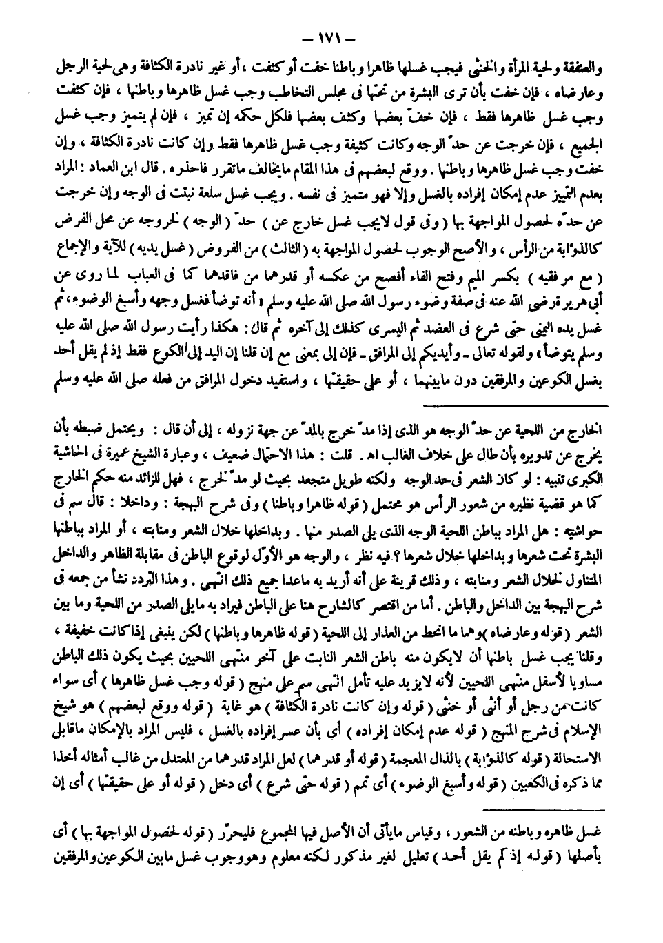 وَالْعَنْفَقَةِ وَلِحْيَةِ الْمَرْأَةِ وَالْخُنْثَى فَيَجِبُ غَسْلُهَا ظَاهِرًا وَبَاطِنًا خَفَّتْ أَوْ كَثُفَتْ، أَوْ غَيْرَ نَادِرَةِ الْكَثَافَةِ وَهِيَ لِحْيَةُ الرَّجُلِ وَعَارِضَاهُ، فَإِنْ خَفَّتْ بِأَنْ تَرَى الْبَشَرَةَ مِنْ تَحْتِهَا فِي مَجْلِسِ التَّخَاطُبِ وَجَبَ غَسْلُ ظَاهِرِهَا وَبَاطِنِهَا، فَإِنْ كَثُفَتْ وَجَبَ غَسْلُ ظَاهِرِهَا فَقَطْ، فَإِنْ خَفَّ بَعْضُهَا وَكَثُفَ بَعْضُهَا فَلِكُلٍّ حُكْمُهُ إنْ تَمَيَّزَ، فَإِنْ لَمْ يَتَمَيَّزْ وَجَبَ غَسْلُ الْجَمِيعِ، فَإِنْ خَرَجَتْ عَنْ حَدِّ الْوَجْهِ وَكَانَتْ كَثِيفَةً وَجَبَ غَسْلُ ظَاهِرِهَا فَقَطْ وَإِنْ كَانَتْ نَادِرَةَ الْكَثَافَةِ، وَإِنْ خَفَّتْ وَجَبَ غَسْلُ ظَاهِرِهَا وَبَاطِنِهَا.