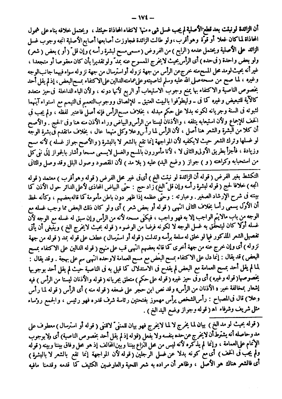 وَقَدْ يُقَالُ: لَمَّا لَمْ يَقُلْ أَحَدٌ بِمَسْحِ الْعِمَامَةِ مَعَ الْبَعْضِ لَمْ يَقْدَحْ فِي الِاسْتِدْلَالِ كَمَا قِيلَ بِهِ فِي النَّاصِيَةِ حَيْثُ لَمْ يَقُلْ أَحَدٌ بِوُجُوبِهَا بِخُصُوصِهَا (قَوْلُهُ: وَغَيْرِهِ) أَيْ وَفِي حَيِّزٍ غَيْرِهِ (قَوْلُهُ: عَلَى حُكْمِ) مُتَعَلِّقٌ بِجَرَيَانِهِ (قَوْلُهُ: وَالْأُذُنَانِ لَيْسَتَا مِنْ الرَّأْسِ) فِيهِ إشْعَارٌ بِمُخَالَفَةِ خَبَرِ «الْأُذُنَانِ مِنْ الرَّأْسِ» وَقَدْ نَصَّ ابْنُ حَجَرٍ عَلَى ضَعْفِهِ (قَوْلُهُ: مِنْهُ) أَيْ الرَّأْسِ (قَوْلُهُ لِمَا رَأَسَ وَعَلَا) قَالَ فِي الْمِصْبَاحِ: رَأَسَ الشَّخْصُ يَرْأَسُ مَهْمُوزٌ بِفَتْحَتَيْنِ رِئَاسَةً شَرُفَ قَدْرُهُ فَهُوَ رَئِيسٌ، وَالْجَمْعُ رُؤَسَاءُ مِثْلَ شَرِيفٍ وَشُرَفَاءَ اهـ (قَوْلُهُ: وَجَوَازُ وَضْعِ الْيَدِ إلَخْ) .