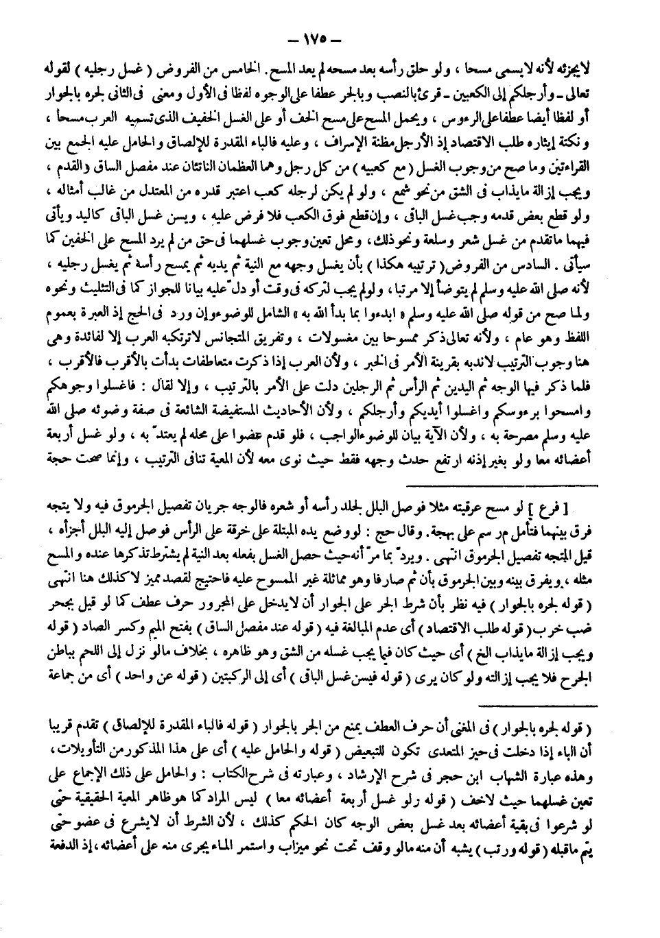 (قَوْلُهُ: لِجَرِّهِ بِالْجِوَارِ) فِيهِ نَظَرٌ بِأَنَّ شَرْطَ الْجَرِّ عَلَى الْجِوَارِ أَنْ لَا يَدْخُلَ عَلَى الْمَجْرُورِ حَرْفُ عَطْفٍ كَمَا لَوْ قِيلَ بِجُحْرِ ضَبٍّ خَرِبٍ (قَوْلُهُ: طَلَبُ الِاقْتِصَادِ) أَيْ عَدَمُ الْمُبَالَغَةِ فِيهِ (قَوْلُهُ: عِنْدَ مَفْصِلِ السَّاقِ) بِفَتْحِ الْمِيمِ وَكَسْرِ الصَّادِ (قَوْلُهُ: وَيَجِبُ إزَالَةُ مَا يُذَابُ إلَخْ) أَيْ حَيْثُ كَانَ فِيمَا يَجِبُ غَسْلُهُ مِنْ الشَّقِّ وَهُوَ ظَاهِرُهُ، بِخِلَافِ مَا لَوْ نَزَلَ إلَى اللَّحْمِ بِبَاطِنِ الْجُرْحِ فَلَا يَجِبُ إزَالَتُهُ وَلَوْ كَانَ يُرَى (قَوْلُهُ: فَيُسَنُّ غَسْلُ الْبَاقِي) أَيْ إلَى الرُّكْبَتَيْنِ