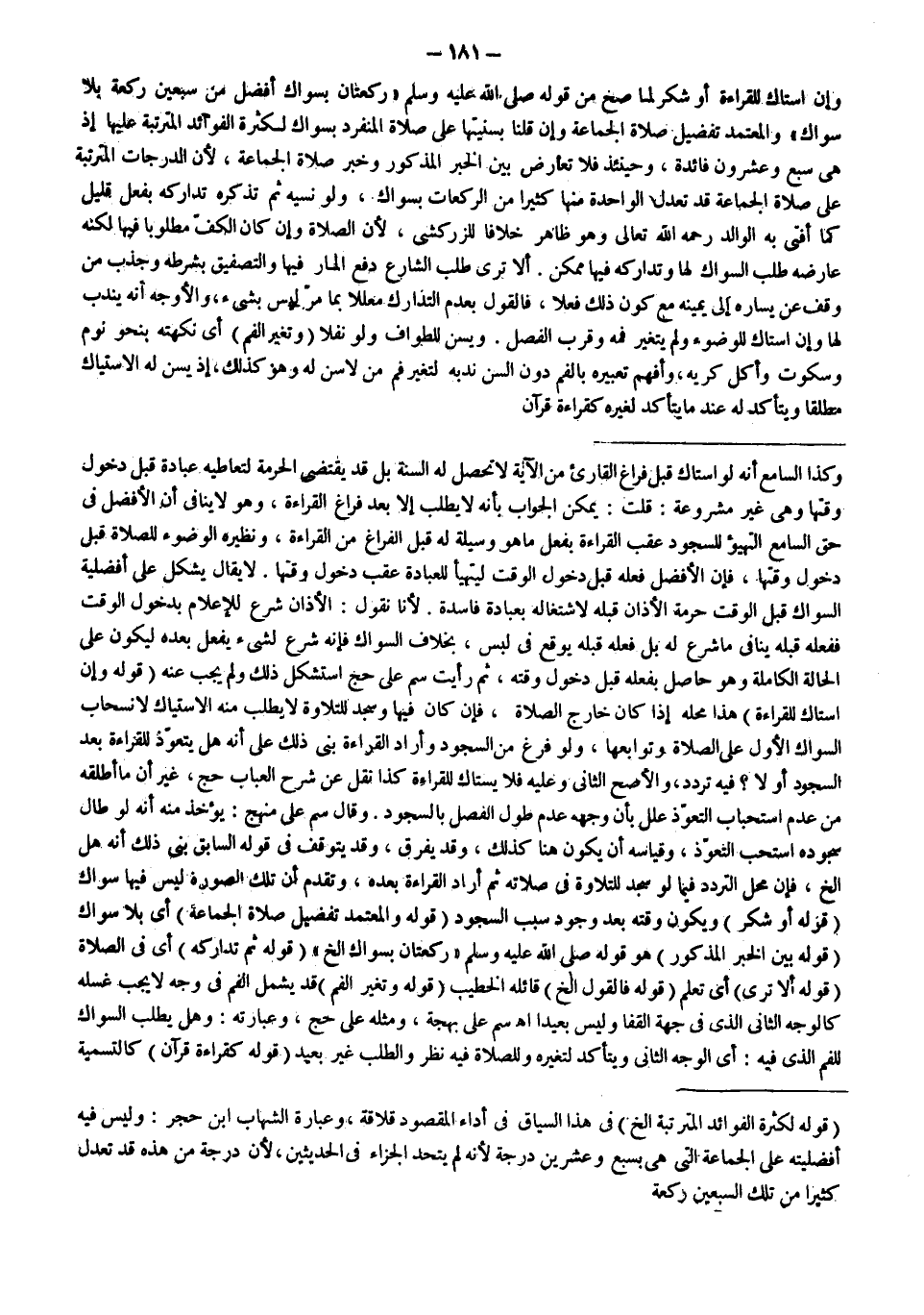 وَإِنْ اسْتَاكَ لِلْقِرَاءَةِ أَوْ شُكْرٍ لِمَا صَحَّ مِنْ قَوْلِهِ - صَلَّى اللَّهُ عَلَيْهِ وَسَلَّمَ - «رَكْعَتَانِ بِسِوَاكٍ أَفْضَلُ مِنْ سَبْعِينَ رَكْعَةً بِلَا سِوَاكٍ» وَالْمُعْتَمَدُ تَفْضِيلُ صَلَاةِ الْجَمَاعَةِ وَإِنْ قُلْنَا بِسُنِّيَّتِهَا عَلَى صَلَاةِ الْمُنْفَرِدِ بِسِوَاكٍ لِكَثْرَةِ الْفَوَائِدِ الْمُتَرَتِّبَةِ عَلَيْهَا إذْ هِيَ سَبْعٌ وَعِشْرُونَ فَائِدَةً، وَحِينَئِذٍ فَلَا تَعَارُضَ بَيْنَ الْخَبَرِ الْمَذْكُورِ وَخَبَرِ صَلَاةِ الْجَمَاعَةِ، لِأَنَّ الدَّرَجَاتِ الْمُتَرَتِّبَةَ عَلَى صَلَاةِ الْجَمَاعَةِ قَدْ تَعْدِلُ الْوَاحِدَةُ مِنْهَا كَثِيرًا مِنْ الرَّكَعَاتِ بِسِوَاكٍ، وَلَوْ نَسِيَهُ ثُمَّ تَذَكَّرَهُ تَدَارَكَهُ بِفِعْلٍ قَلِيلٍ كَمَا أَفْتَى بِهِ الْوَالِدُ - رَحِمَهُ اللَّهُ تَعَالَى - وَهُوَ ظَاهِرٌ خِلَافًا لِلزَّرْكَشِيِّ، لِأَنَّ الصَّلَاةَ وَإِنْ كَانَ الْكَفُّ مَطْلُوبًا فِيهَا لَكِنَّهُ عَارَضَهُ طَلَبُ السِّوَاكِ لَهَا وَتَدَارُكُهُ فِيهَا مُمْكِنٌ.