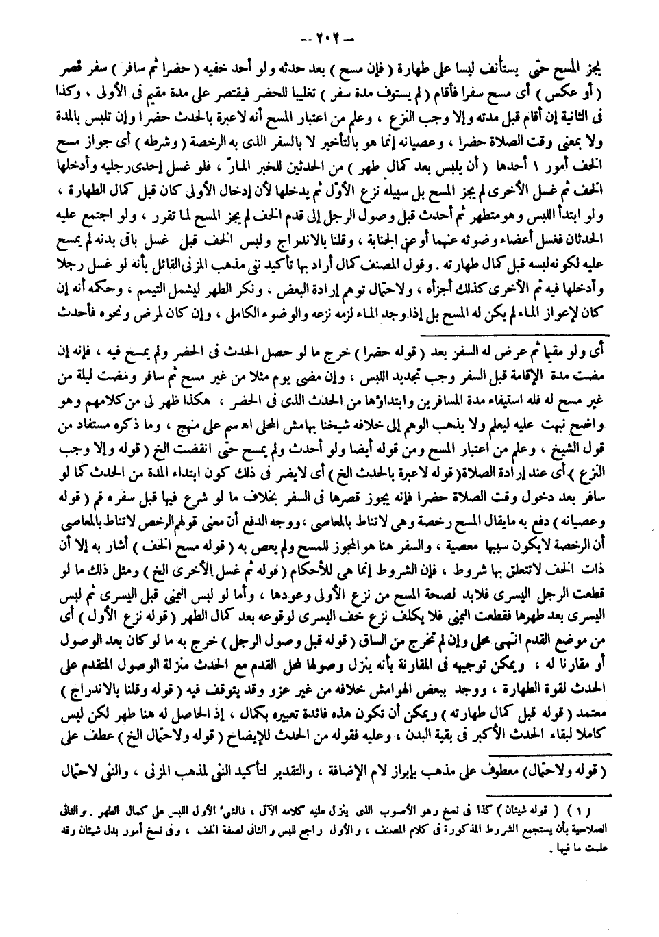 وَقَوْلُ الْمُصَنِّفِ كَمَالِ أَرَادَ بِهَا تَأْكِيدَ نَفْيِ مَذْهَبِ الْمُزَنِيّ الْقَائِلِ بِأَنَّهُ لَوْ غَسَلَ رِجْلًا وَأَدْخَلَهَا فِيهِ ثُمَّ الْأُخْرَى كَذَلِكَ أَجْزَأَهُ، وَلِاحْتِمَالِ تَوَهُّمِ إرَادَةِ الْبَعْضِ، وَنَكَّرَ الطُّهْرَ لِيَشْمَلَ التَّيَمُّمَ، وَحُكْمُهُ أَنَّهُ إنْ كَانَ لِإِعْوَازِ الْمَاءِ لَمْ يَكُنْ لَهُ الْمَسْحُ بَلْ إذَا وَجَدَ الْمَاءَ لَزِمَهُ نَزْعُهُ وَالْوُضُوءُ الْكَامِلُ، وَإِنْ كَانَ لِمَرَضٍ وَنَحْوِهِ فَأَحْدَثَ