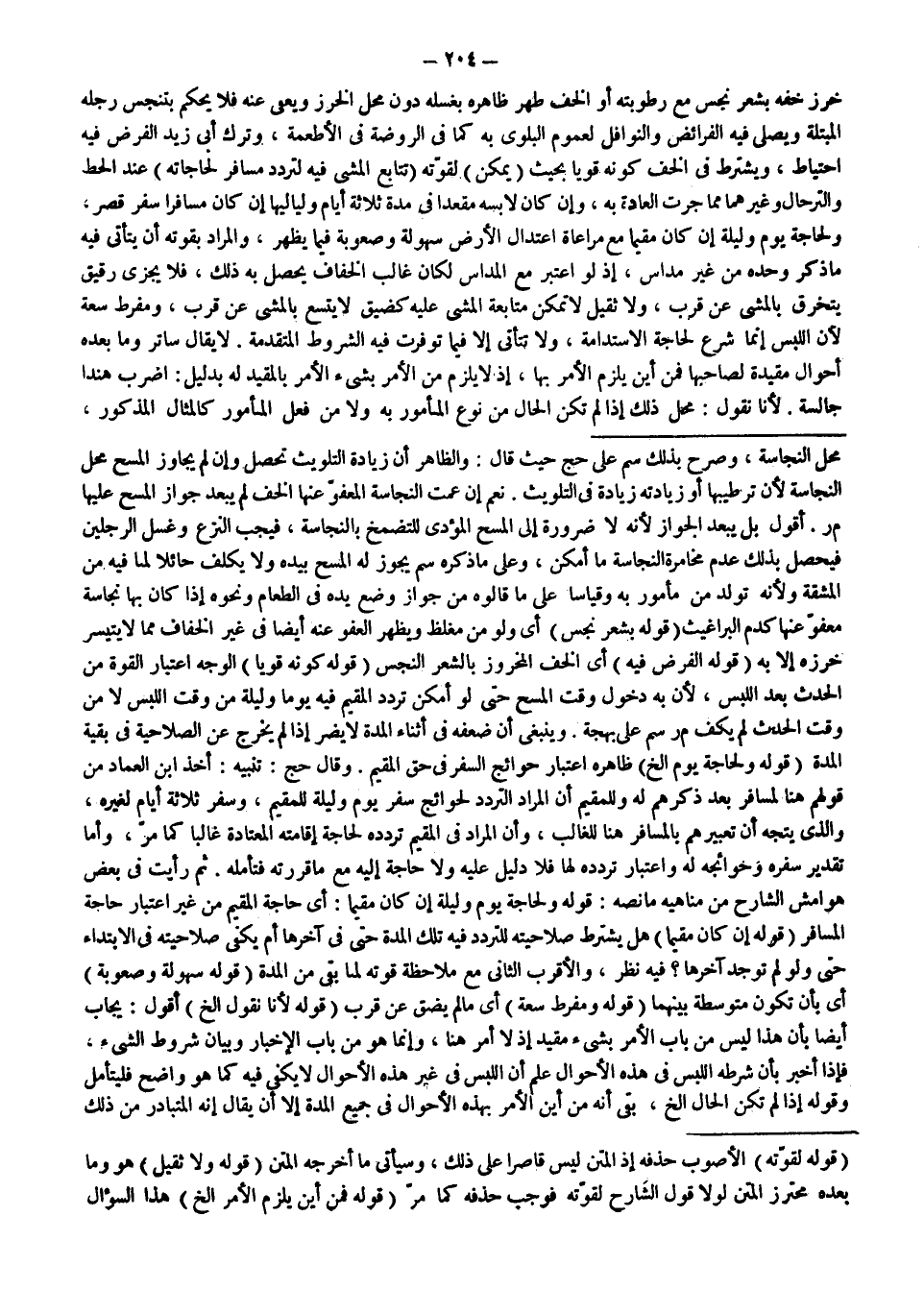 ثُمَّ رَأَيْت فِي بَعْضِ هَوَامِشِ الشَّارِحِ مِنْ مَنَاهِيهِ مَا نَصُّهُ: قَوْلُهُ: وَلِحَاجَةِ يَوْمٍ وَلَيْلَةٍ إنْ كَانَ مُقِيمًا: أَيْ حَاجَةُ الْمُقِيمِ مِنْ غَيْرِ اعْتِبَارِ حَاجَةِ الْمُسَافِرِ (قَوْلُهُ: إنْ كَانَ مُقِيمًا) هَلْ يُشْتَرَطُ صَلَاحِيَّتُهُ لِلتَّرَدُّدِ فِيهِ تِلْكَ الْمُدَّةِ حَتَّى فِي آخِرِهَا أَمْ يَكْفِي صَلَاحِيَّتُهُ فِي الِابْتِدَاءِ حَتَّى وَلَوْ لَمْ تُوجَدْ آخِرُهَا؟ فِيهِ نَظَرٌ، وَالْأَقْرَبُ الثَّانِي مَعَ مُلَاحَظَةِ قُوَّتِهِ لِمَا بَقِيَ مِنْ الْمُدَّةِ (قَوْلُهُ: سُهُولَةً وَصُعُوبَةً) أَيْ بِأَنْ تَكُونَ مُتَوَسِّطَةً بَيْنَهُمَا (قَوْلُهُ: وَمُفْرِطُ سَعَةٍ) أَيْ مَا لَمْ يَضِقْ عَنْ قُرْبٍ (قَوْلُهُ: لِأَنَّا نَقُولُ إلَخْ) أَقُولُ: يُجَابُ أَيْضًا بِأَنَّ هَذَا لَيْسَ مِنْ بَابِ الْأَمْرِ بِشَيْءٍ مُقَيَّدٍ إذْ لَا أَمْرَ هُنَا، وَإِنَّمَا هُوَ مِنْ بَابِ الْإِخْبَارِ وَبَيَانِ شُرُوطِ الشَّيْءِ، فَإِذَا أَخْبَرَ بِأَنَّ شَرْطَهُ اللِّبْسُ فِي هَذِهِ الْأَحْوَالِ عُلِمَ أَنَّ اللِّبْسَ فِي غَيْرِ هَذِهِ الْأَحْوَالِ لَا يَكْفِي فِيهِ كَمَا هُوَ وَاضِحٌ فَلْيُتَأَمَّلْ، وَقَوْلُهُ: إذَا لَمْ تَكُنْ الْحَالُ إلَخْ، بَقِيَ أَنَّهُ مِنْ أَيْنَ الْأَمْرُ بِهَذِهِ الْأَحْوَالِ فِي جَمِيعِ الْمُدَّةِ إلَّا أَنْ يُقَالَ إنَّهُ الْمُتَبَادَرُ مِنْ ذَلِكَ