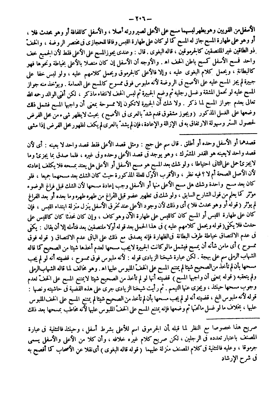 قَالَ: وَعِنْدِي يَجُوزُ الْمَسْحُ عَلَى الْأَعْلَى فَقَطْ لِأَنَّ الْجَمِيعَ خُفٌّ وَاحِدٌ فَمَسْحُ الْأَسْفَلِ كَمَسْحِ بَاطِنِ الْخُفِّ اهـ.