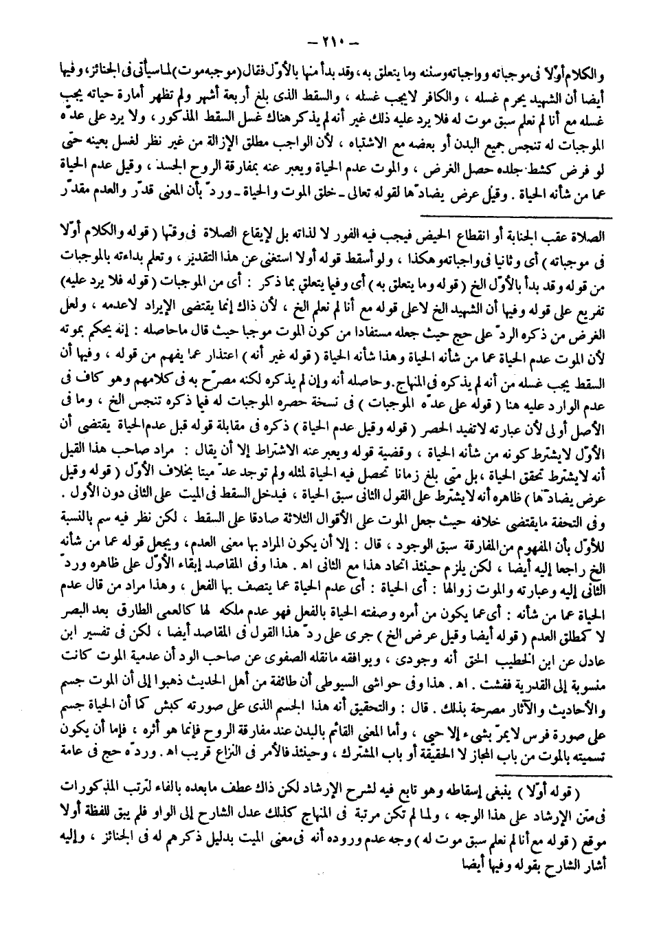 وَالْكَلَامُ أَوَّلًا فِي مُوجِبَاتِهِ وَوَاجِبَاتِهِ وَسُنَنِهِ وَمَا يَتَعَلَّقُ بِهِ، وَقَدْ بَدَأَ مِنْهَا بِالْأَوَّلِ فَقَالَ (مُوجِبُهُ مَوْتٌ) لِمَا سَيَأْتِي فِي الْجَنَائِزِ، وَفِيهَا أَيْضًا أَنَّ الشَّهِيدَ يَحْرُمُ غُسْلُهُ، وَالْكَافِرُ لَا يَجِبُ غُسْلُهُ، وَالسَّقْطُ الَّذِي بَلَغَ أَرْبَعَةَ أَشْهُرٍ وَلَمْ تَظْهَرْ أَمَارَةُ حَيَاتِهِ يَجِبُ غُسْلُهُ مَعَ أَنَّا لَمْ نَعْلَمْ سَبْقَ مَوْتٍ لَهُ فَلَا يُرَدُّ عَلَيْهِ ذَلِكَ غَيْرَ أَنَّهُ لَمْ يَذْكُرْ هُنَاكَ غُسْلَ السَّقْطِ الْمَذْكُورِ، وَلَا يَرُدُّ عَلَى عَدِّهِ الْمُوجِبَاتِ لَهُ تَنَجُّسُ جَمِيعِ الْبَدَنِ أَوْ بَعْضِهِ مَعَ الِاشْتِبَاهِ، لِأَنَّ الْوَاجِبَ مُطْلَقُ الْإِزَالَةِ مِنْ غَيْرِ نَظَرٍ لِغُسْلٍ بِعَيْنِهِ حَتَّى لَوْ فَرَضَ كَشْطَ جِلْدِهِ حَصَلَ الْغَرَضُ، وَالْمَوْتُ عَدَمُ الْحَيَاةِ وَيُعَبَّرُ عَنْهُ بِمُفَارَقَةِ الرُّوحِ الْجَسَدِ، وَقِيلَ عَدَمُ الْحَيَاةِ عَمَّا مِنْ شَأْنِهِ الْحَيَاةُ.